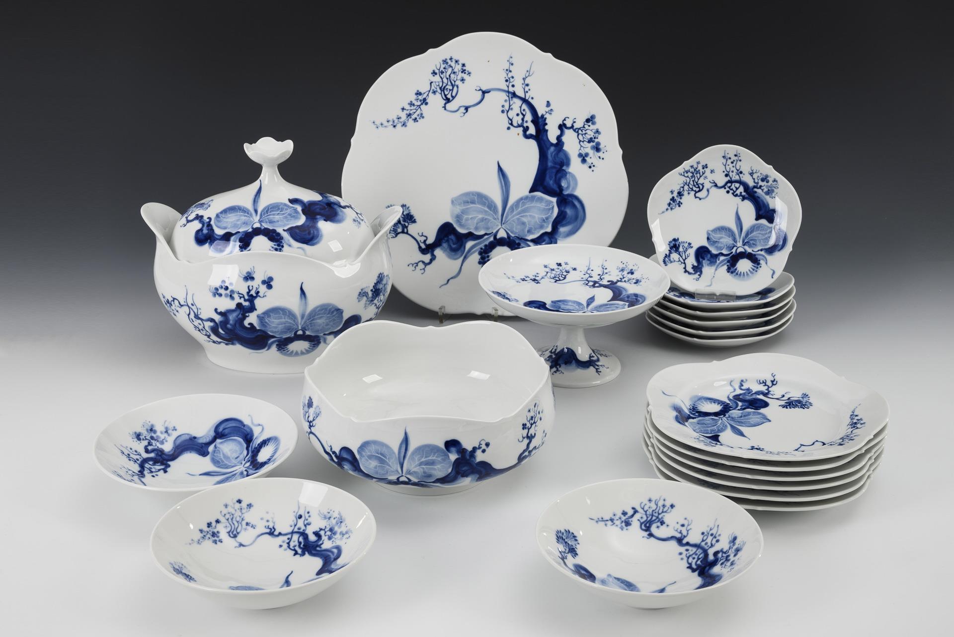 19 Teile Porzellan "Blaue Orchidee auf Ast". Meissen.