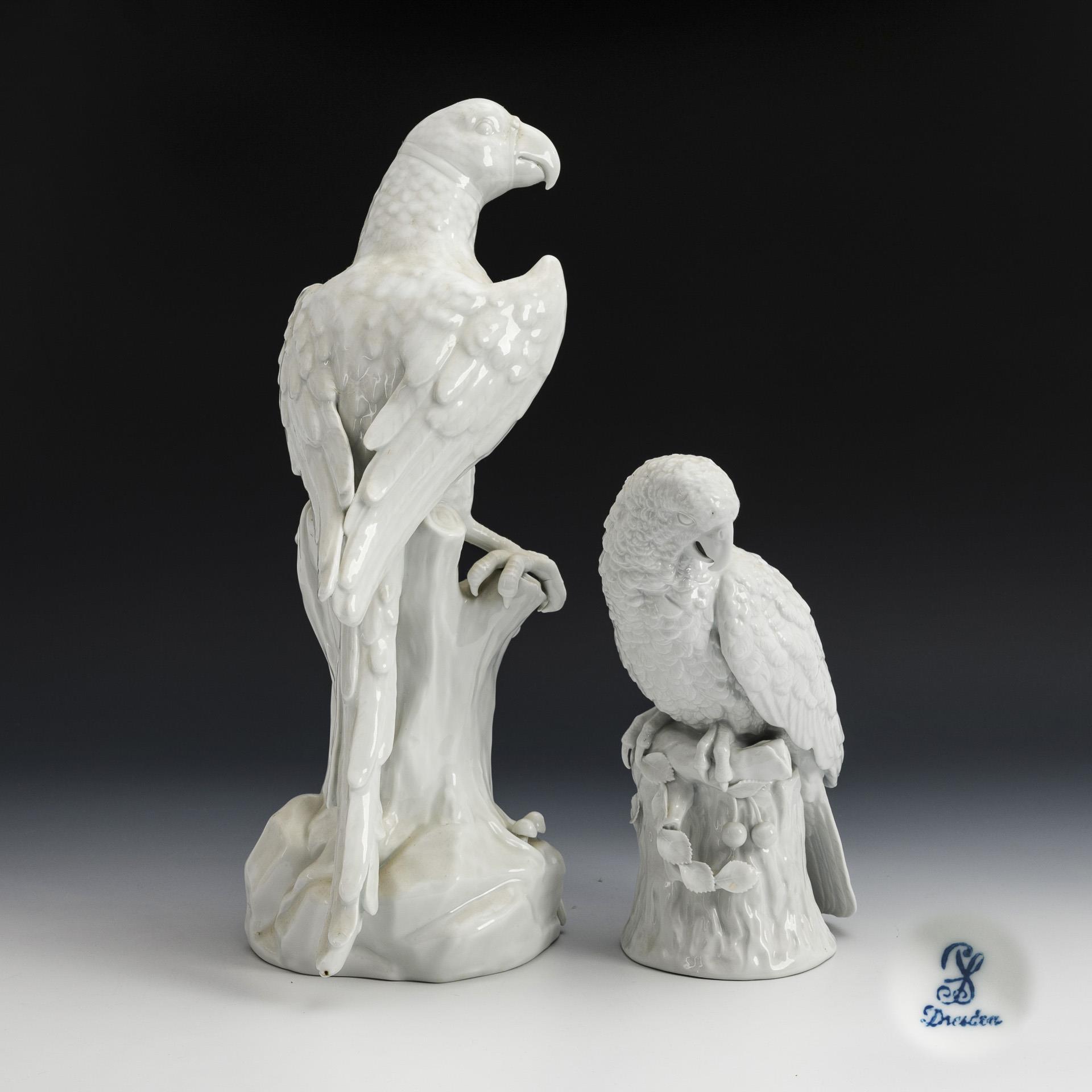 2 verschiedene Plastiken von einem auf einen Baumstamm mit Kirschen sitzendem Papagei.