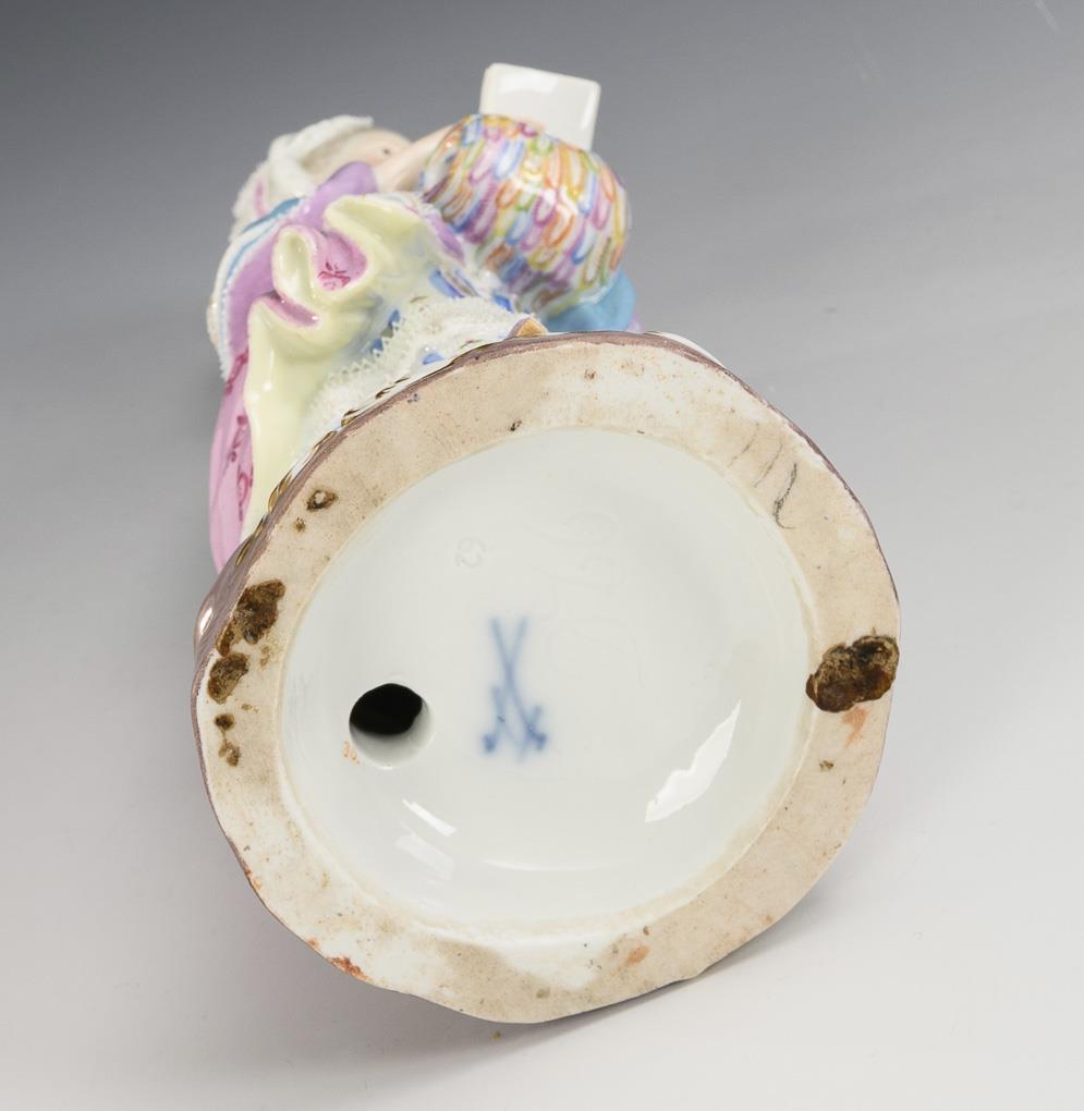 Auf einem Rocaille- und Terrainsockel stehende Dame in winterlicher Kleidung, einen Brief lesend. Spitze minimal bestoßen.