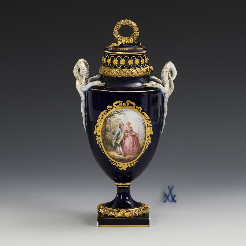 Ovoider Korpus mit zwei Schlangenhenkeln, durchbrochenem Deckel mit Eichenlaubgriff und Rundfuß mit umgelegtem Eichenlaubkranz und Quadratplinthe. Kobaltfond, beidseitig ein ovales Medaillon mit galanten Paaren in einer Parklandschaft. Bänder des Eichenlaubkranzes am Deckel teils bestoßen, 2 Sockelecken bestoßen.
