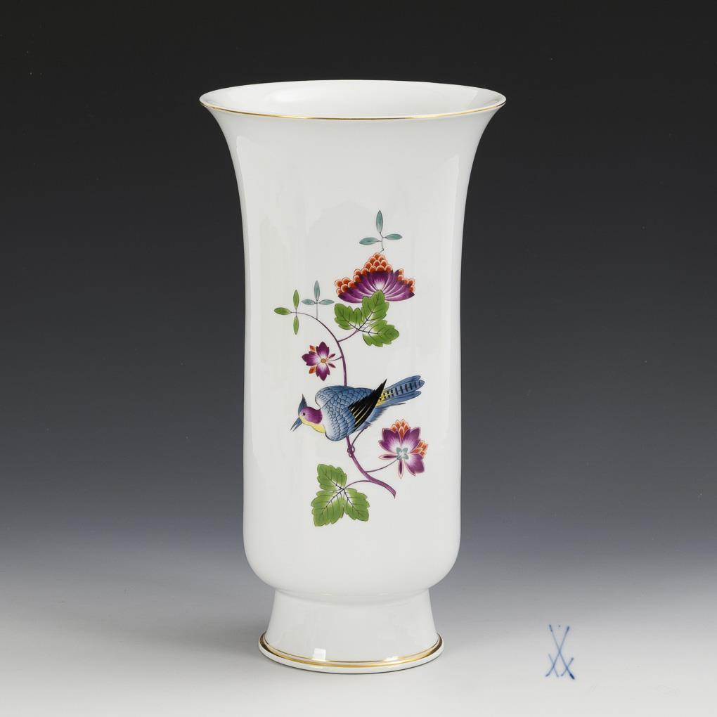 Kratervase mit konischem Fuß. Schauseitig indianische Vogel- und Blumenmalerei. Am Fuß herstellungsbedingt kleine Unregelmäßigkeiten am Goldrand.