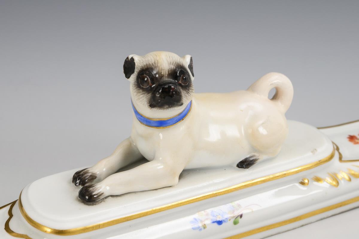 Länglicher Sockel mit der Plastik eines liegenden Mopses. Minimale Bestoßung am rechten Ohr.