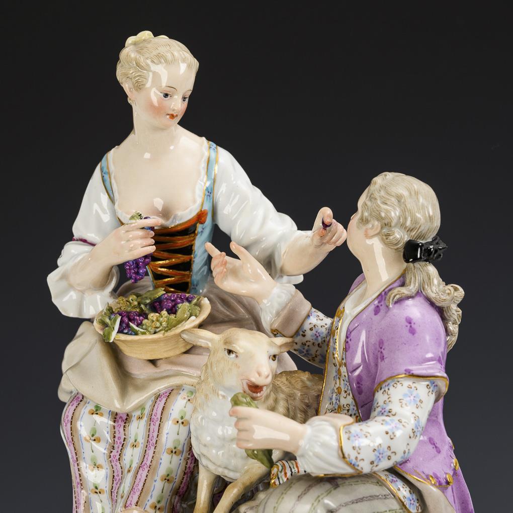 Auf einem Felssockel sitzendes Schäferpaar mit Schaf und Traubenkorb. Einige Blätter bestoßen, Chip am linken Ärmel der Schäferin.