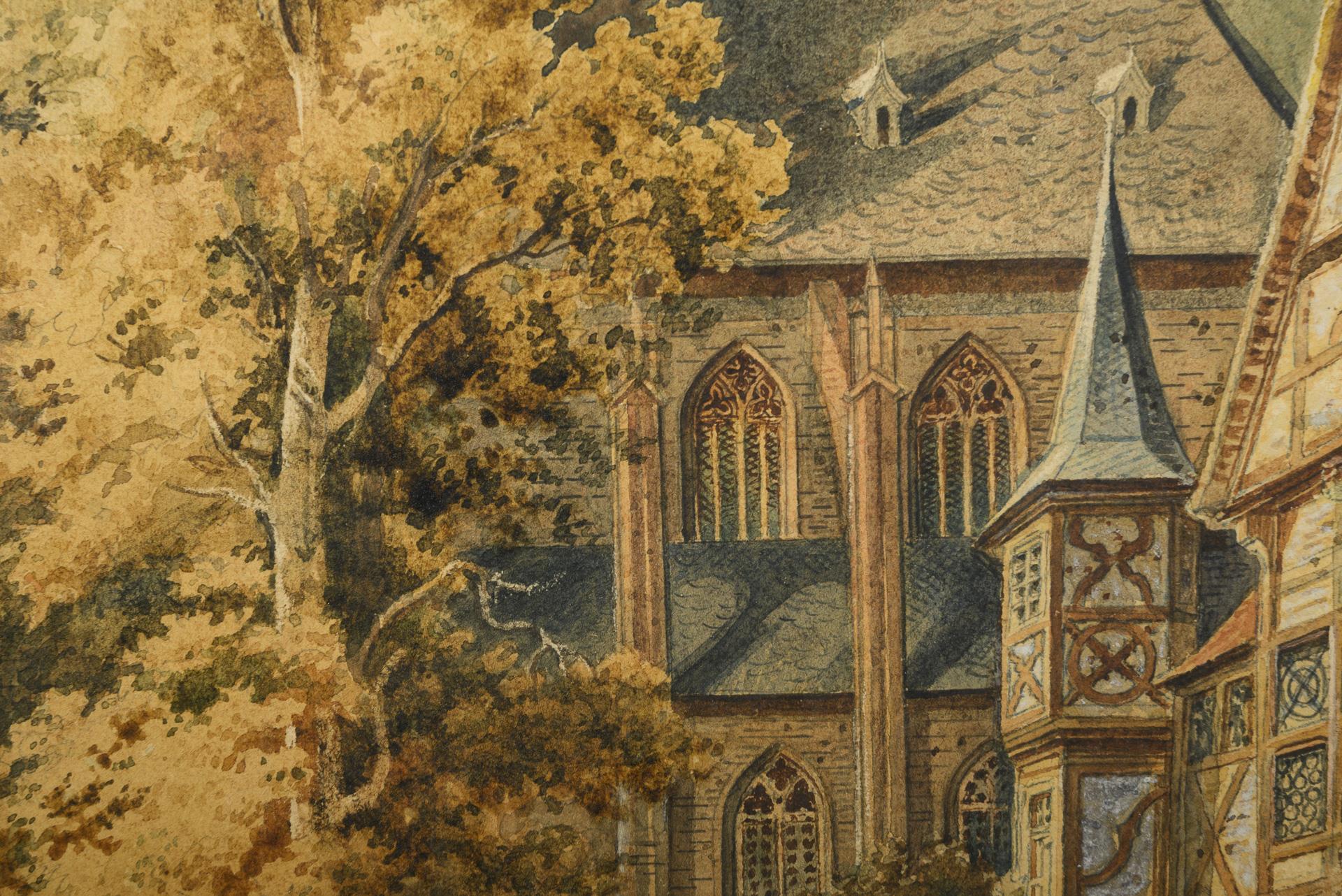 Staffagefiguren auf der Straße zwischen den detailliert gemalten Fachwerkhäusern vor der gotischen Kirche.