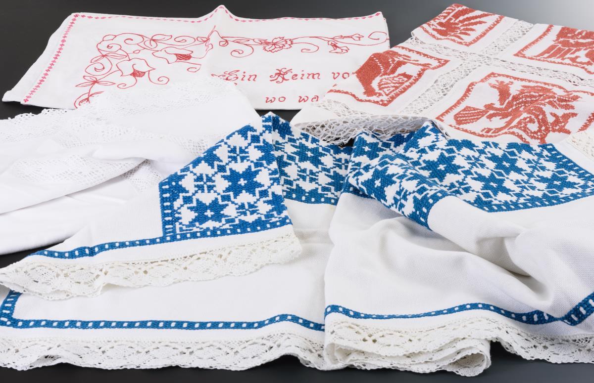 Baumwolle bzw Halbleinen bestickt, Klöppelspitze. 110 x 69, 112 x 107, 132 x 126 bzw. 136 x 98 cm.