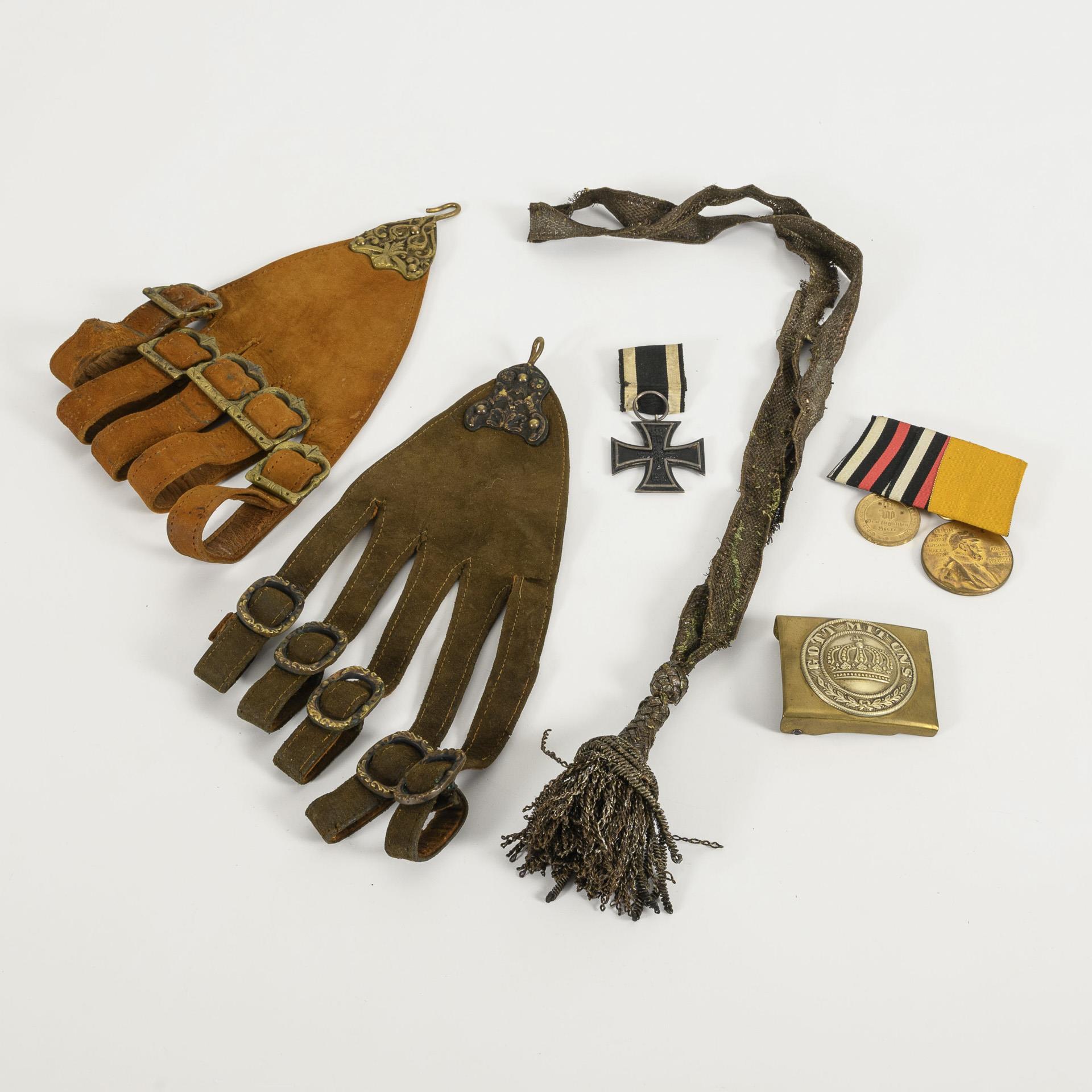 Koppelschloß "Gott mit uns" Krone / Ordensspange: 100. Geburtstag Kaiser Wilhelm I. und Kriegsdenkmünze für Kämpfer 1870/71 / Portepee / 2 lederne Säbelschlaufen / Eisernes Kreuz 1914, 2. Klasse.