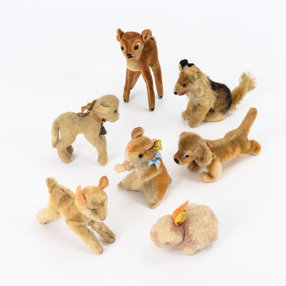 Samt-"Bambi", "Lamby" mit Glöckchen, springendes Lamm, Hamster, Schäferhund, Dackel und Woll-Häschen. Altersspuren.