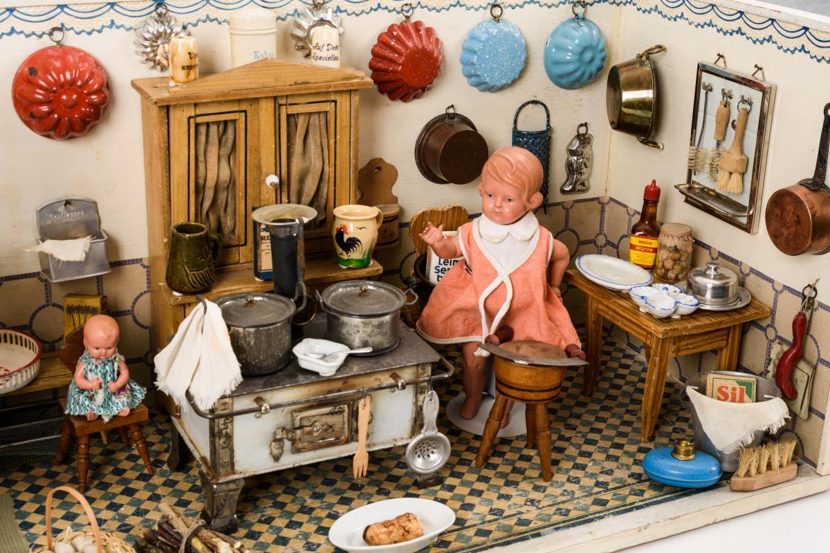 Komplett eingerichtetes 1-Raum-Gehäuse mit seltenem Porzellanwaschbecken, Spiritusherd aus Blech, Küchenbüffet, Tisch, Stuhl und zahlreichem Zubehör. Dazu Schildkrötpuppe (L 20,5 cm). Altersspuren, teils minimale Defekte.