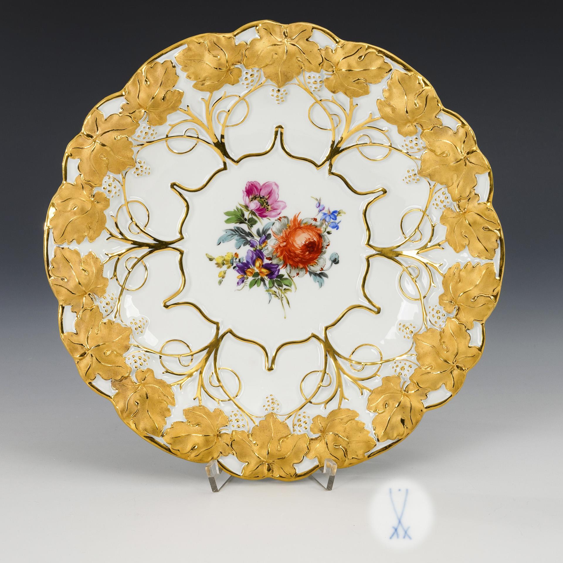 Schale mit goldbronziertem Weinlaubrelief. Im Spiegel ein Blumenbukett mit Anemone und Federmohn.