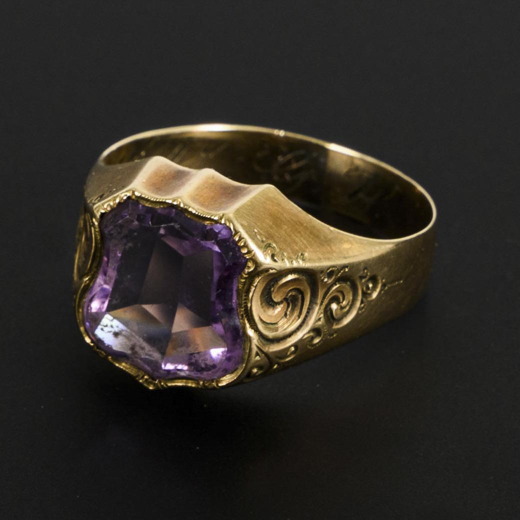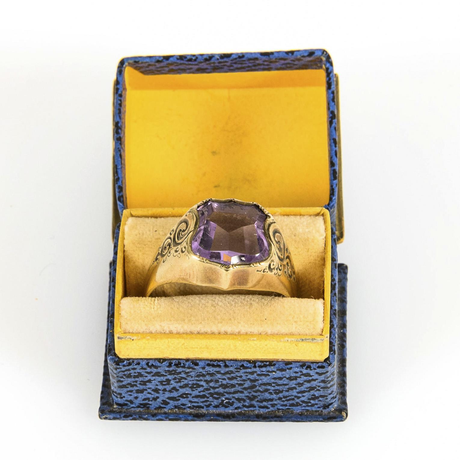 Ring mit in Wappenform geschliffenem Amethyst, in breiter Schiene mit Ziergravur, in Rankengestaltung auf den Ringschultern.