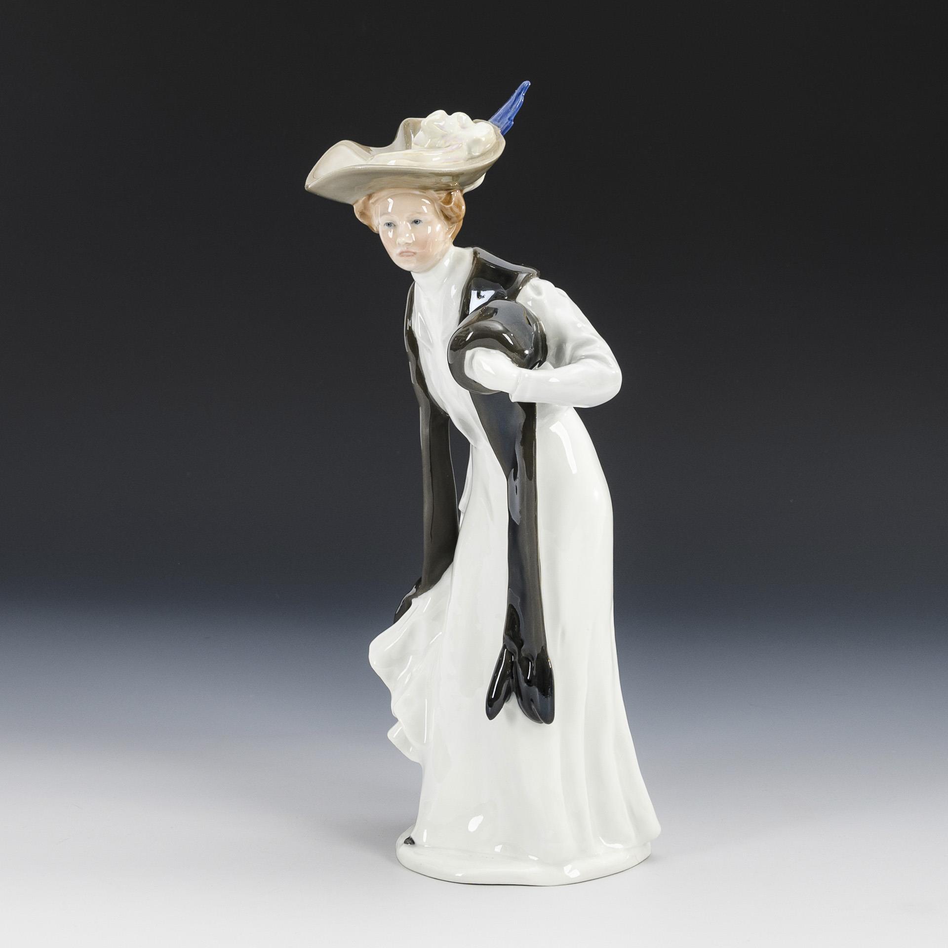 Elegante, stehende Dame mit Hut, Pelz und Muff. Hutfeder restauriert.