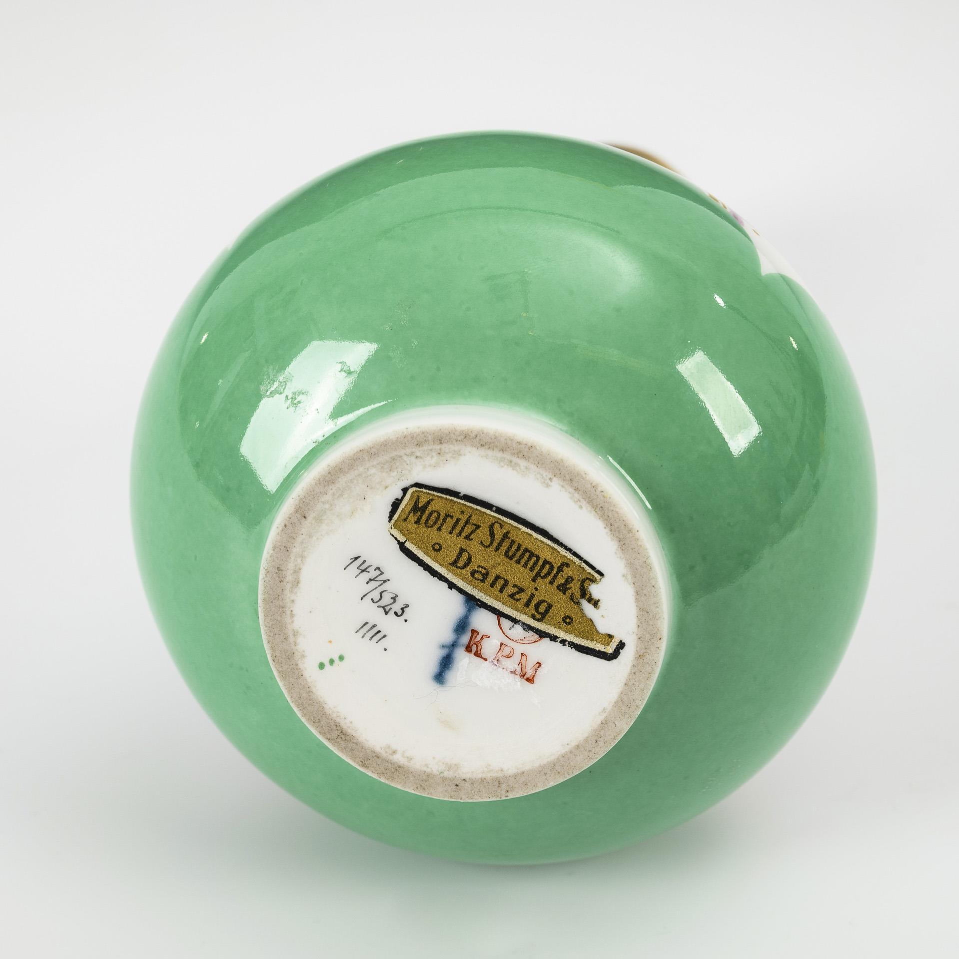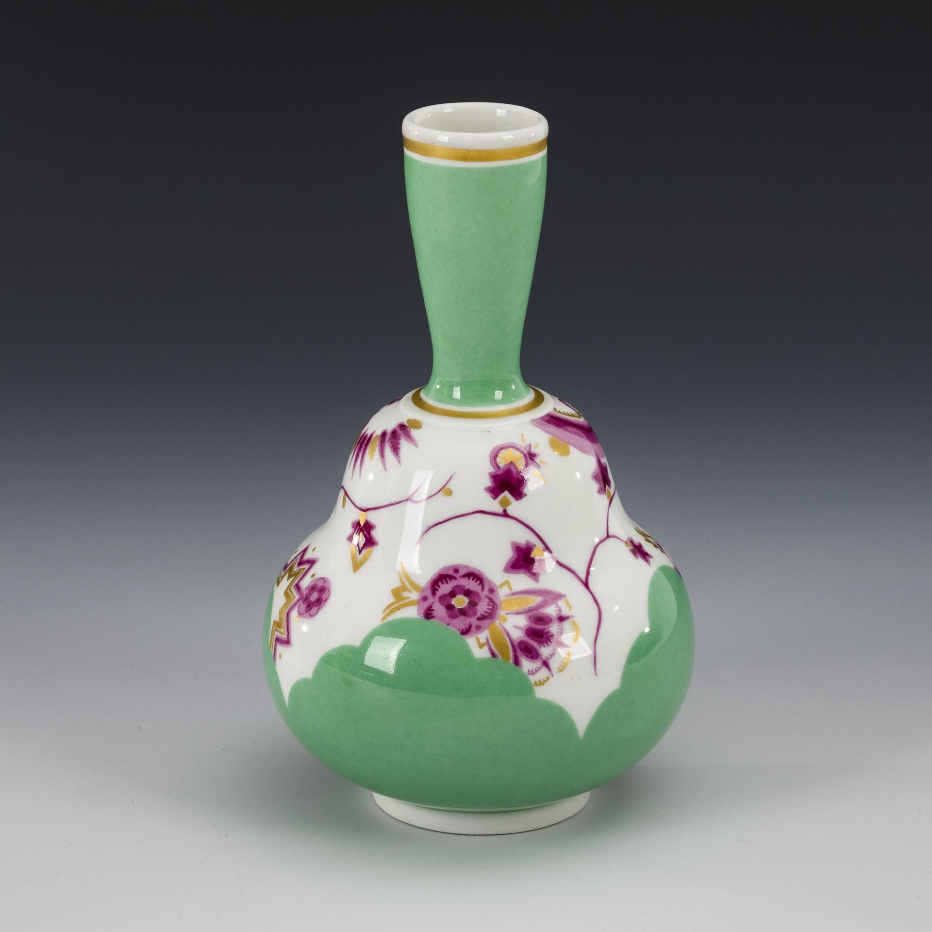 Balusterkorpus mit konischem Hals. Grüner, wolkiger Teilfond und stilisierte Blumenmalerei in Purpur und Gold.