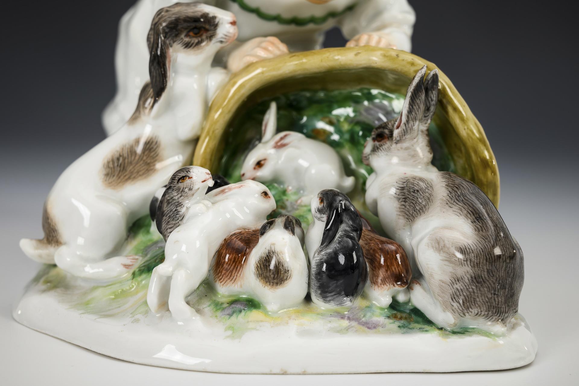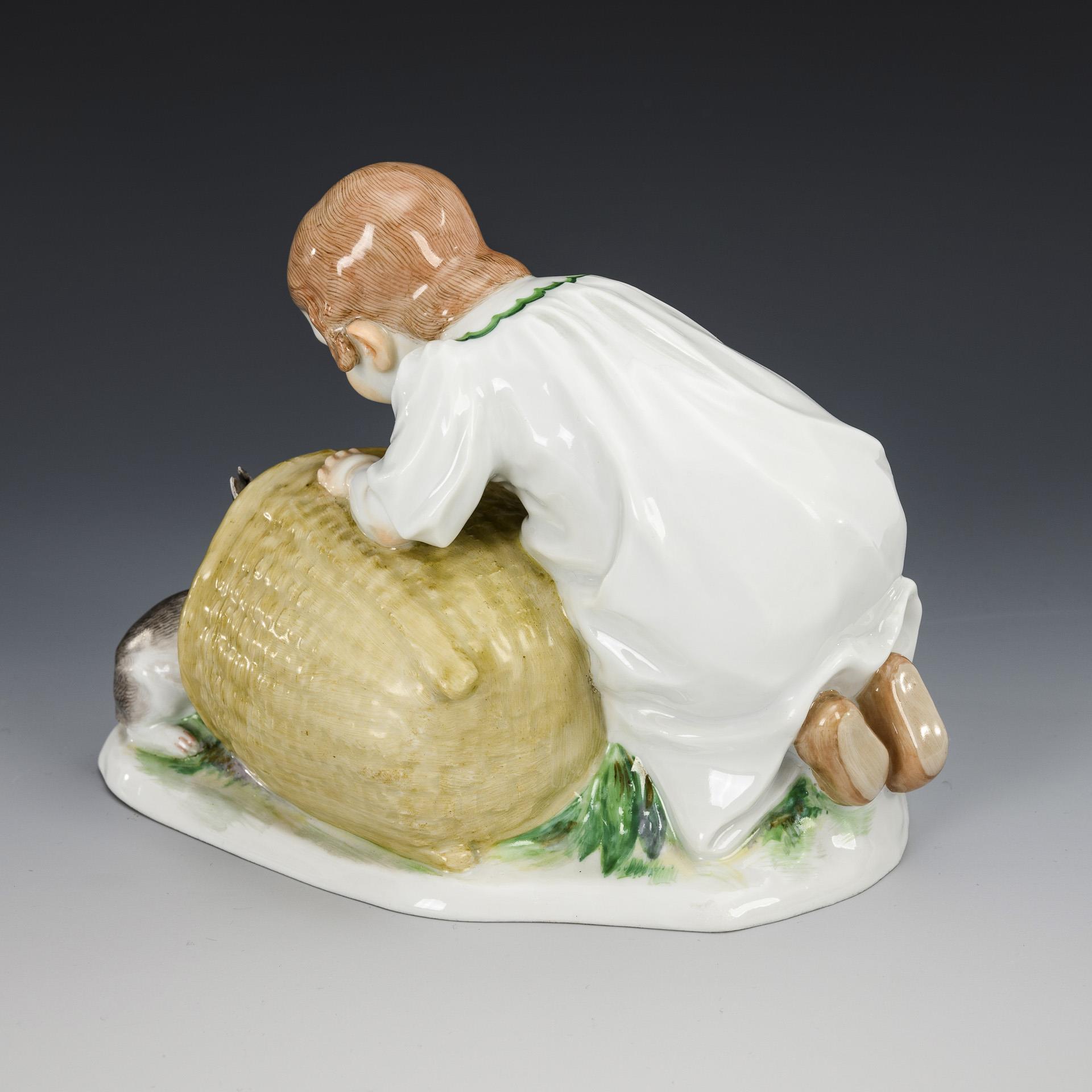Sich über einen umgestürzten Graskorb beugendes, eine Kaninchenfamilie beim Fressen betrachtendes Kind.