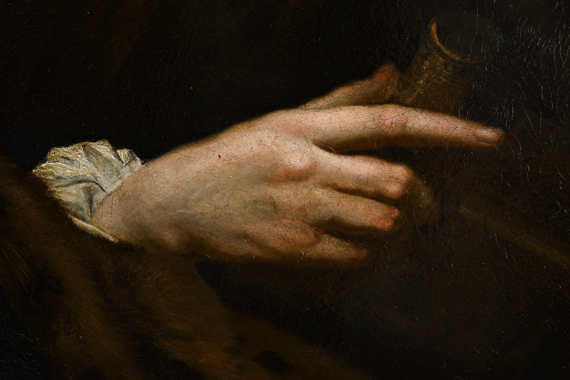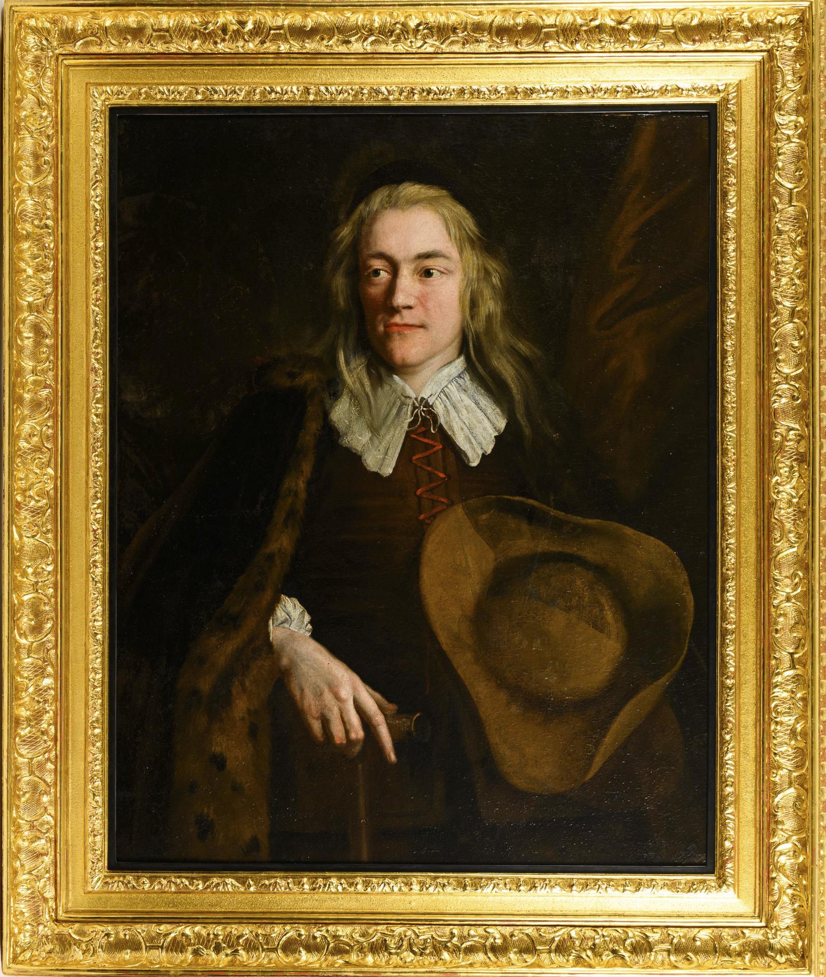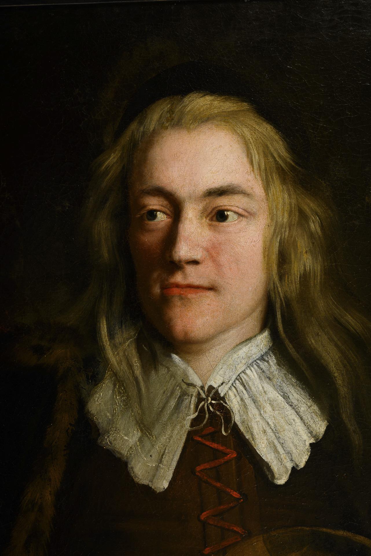 Porträt des jungen Mannes mit langem Haar und im pelzverbrämten Mantel vor dunklem Hintergrund. Leinwand doubliert.