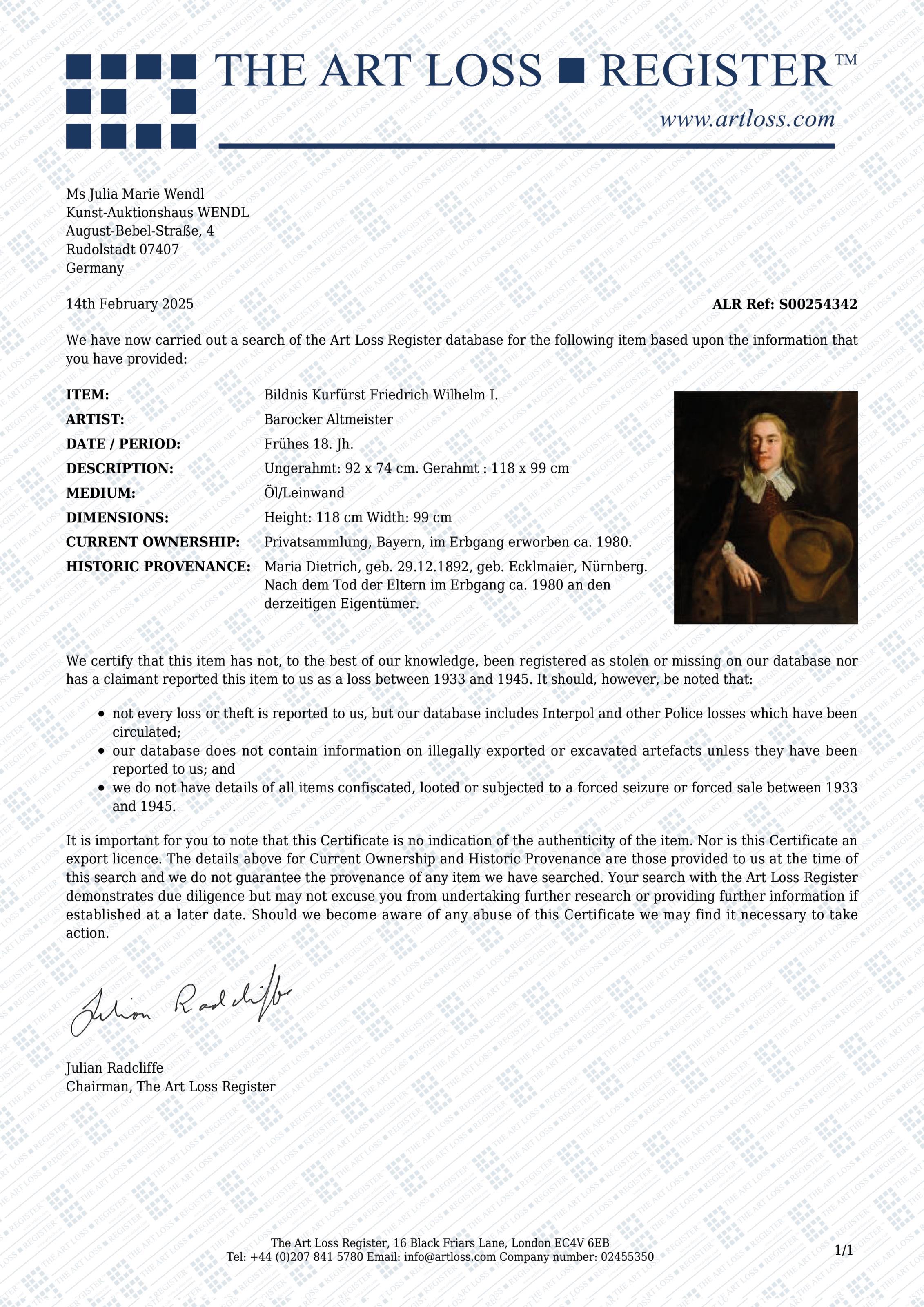 Alle Lose mit einem Limit (Startpreis) von mind. 1.500€ werden mit der Art Loss Register Datenbank abgeglichen. Die Einzelprüfung bei „The Art Loss Register“ ergab keine Bedenken bezüglich potenziell streitiger Besitzansprüche. Zertifikat liegt vor..