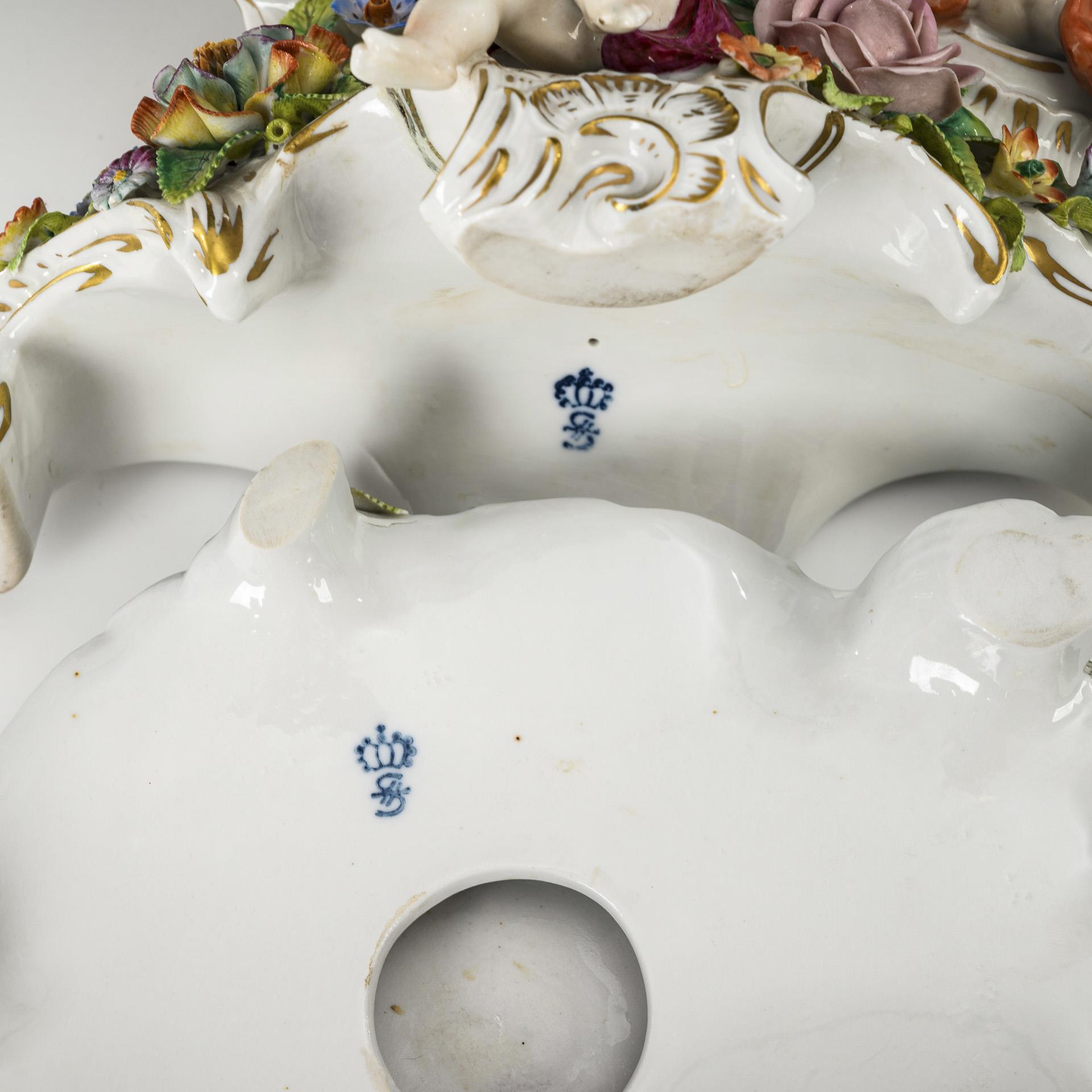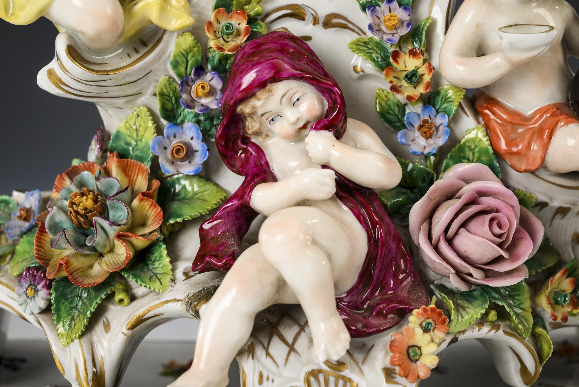 Rocaillegehäuse mit reichem Blütenbelag, vier Jahreszeitenfiguren und Blumendekor, auf blütenbelegtem Sockel. 1 Arm geklebt, Uhr läuft nicht.