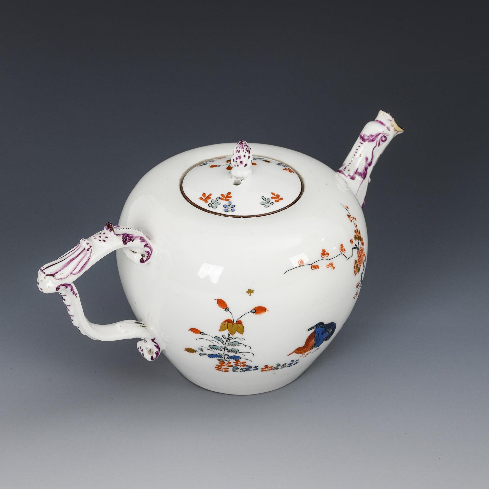Teekännchen mit Rocaillehenkel und -schneppe sowie Knospenknaufdeckel. Im Stil der japanischen Manufaktur Sakaida Kakiemon bemalt mit einem Wachtelpaar, umgeben von einem Prunusbaum, Blütenstaude und Bambussprossen. 2 minimale Restaurierungen an der Schneppe.