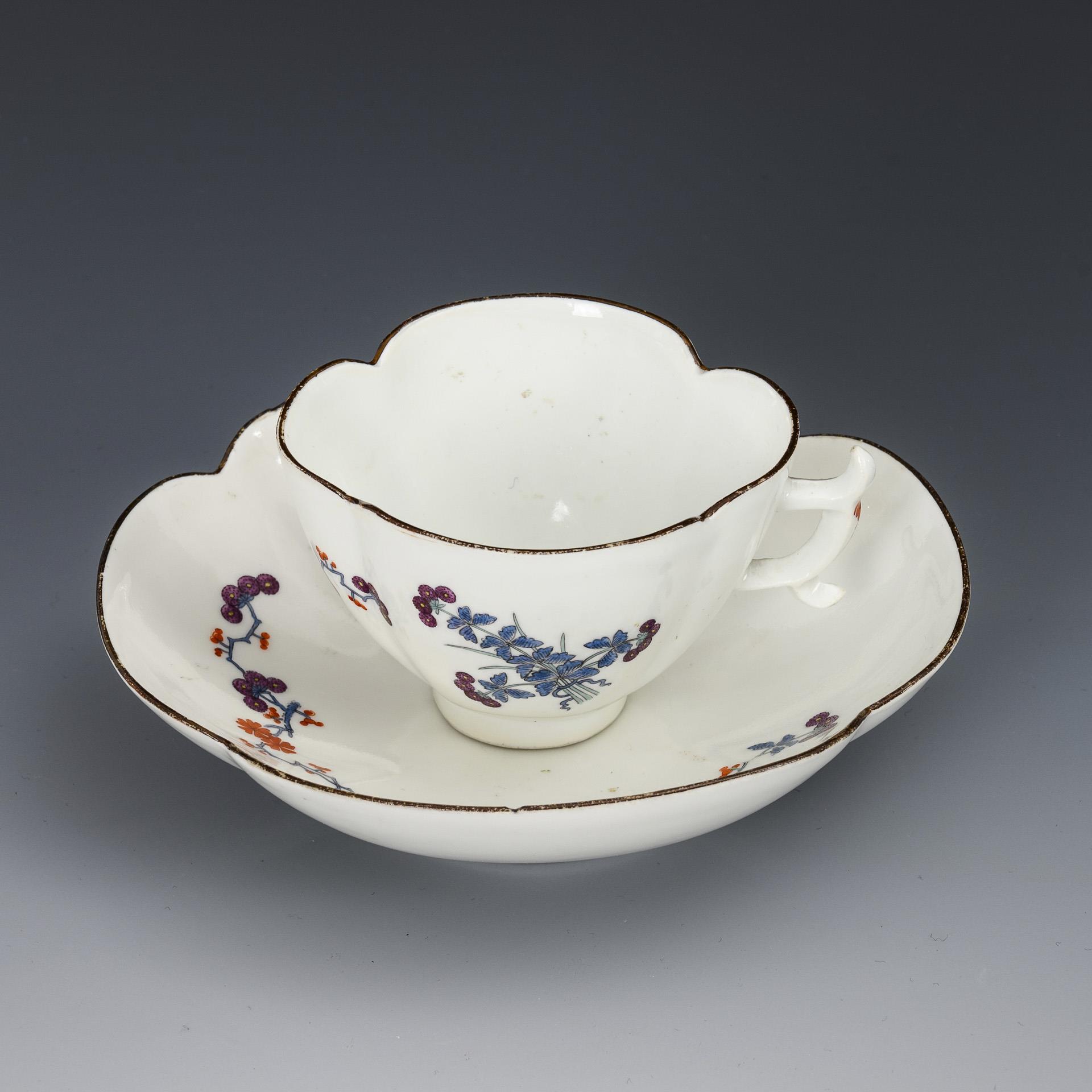Vierpasstasse mit spitz geschweiftem Henkel. 2 minimale, herstellungsbedingte Bestoßungen am Untertassenrand.