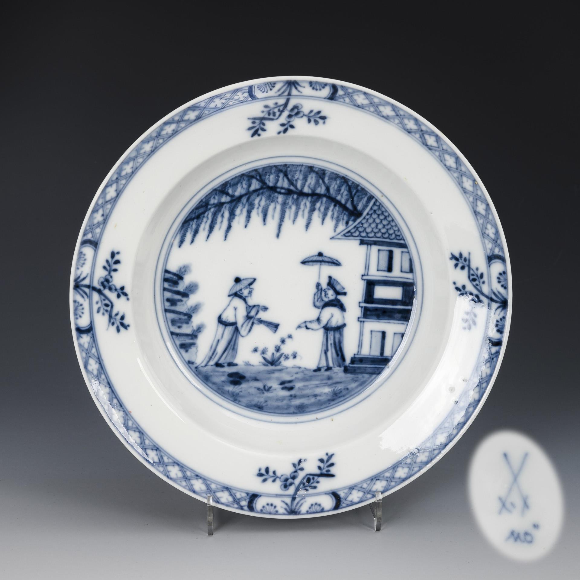 Barocker Teller mit unterglasurblauer Chinoiseriemalerei. Meissen.