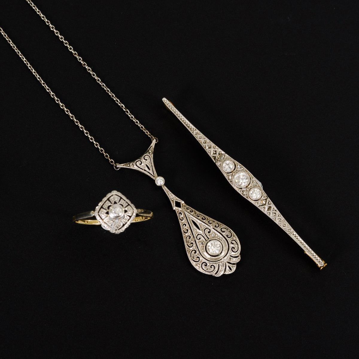 3 Schmuckteile Art déco mit Altschliff-Brillanten und Diamanten.