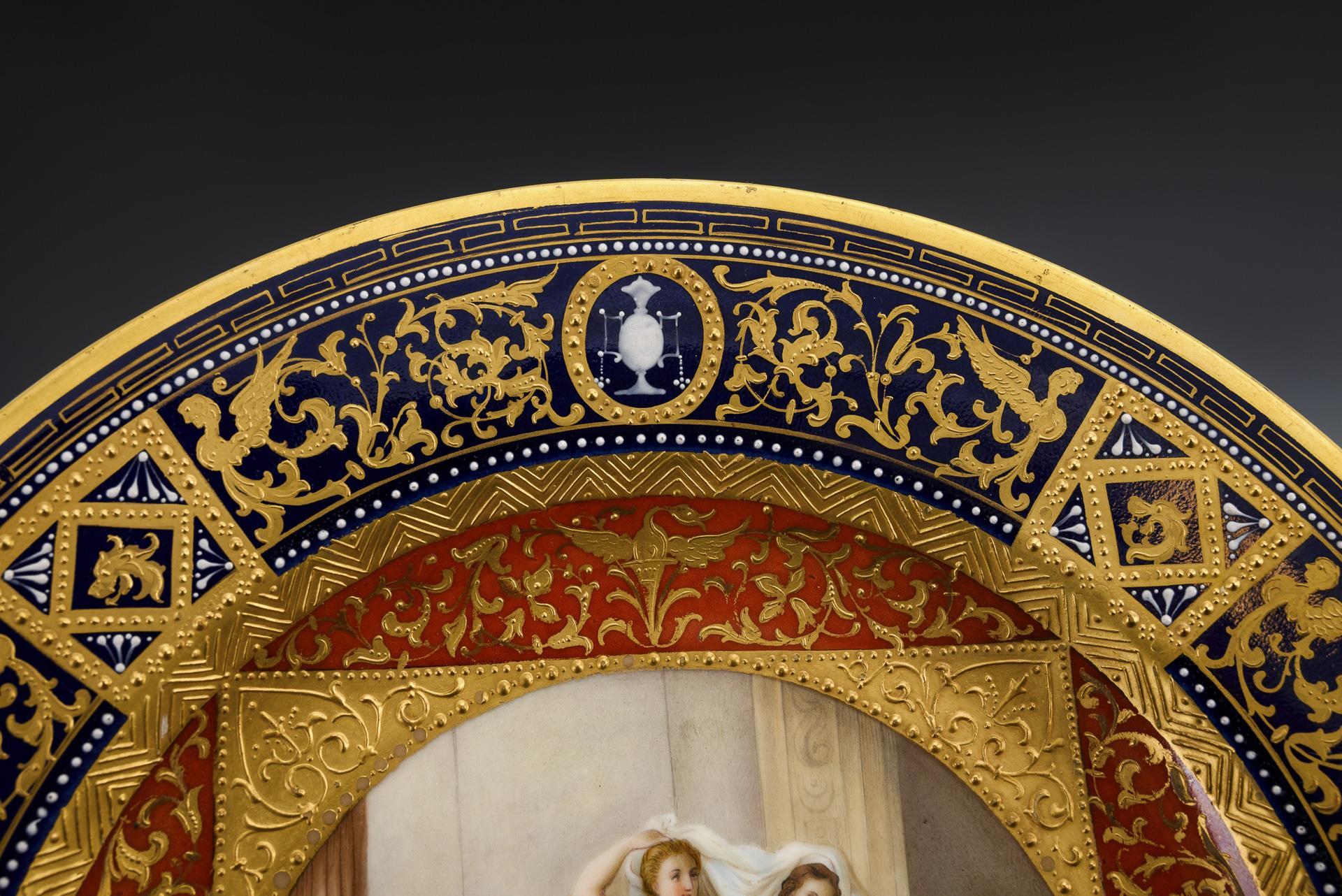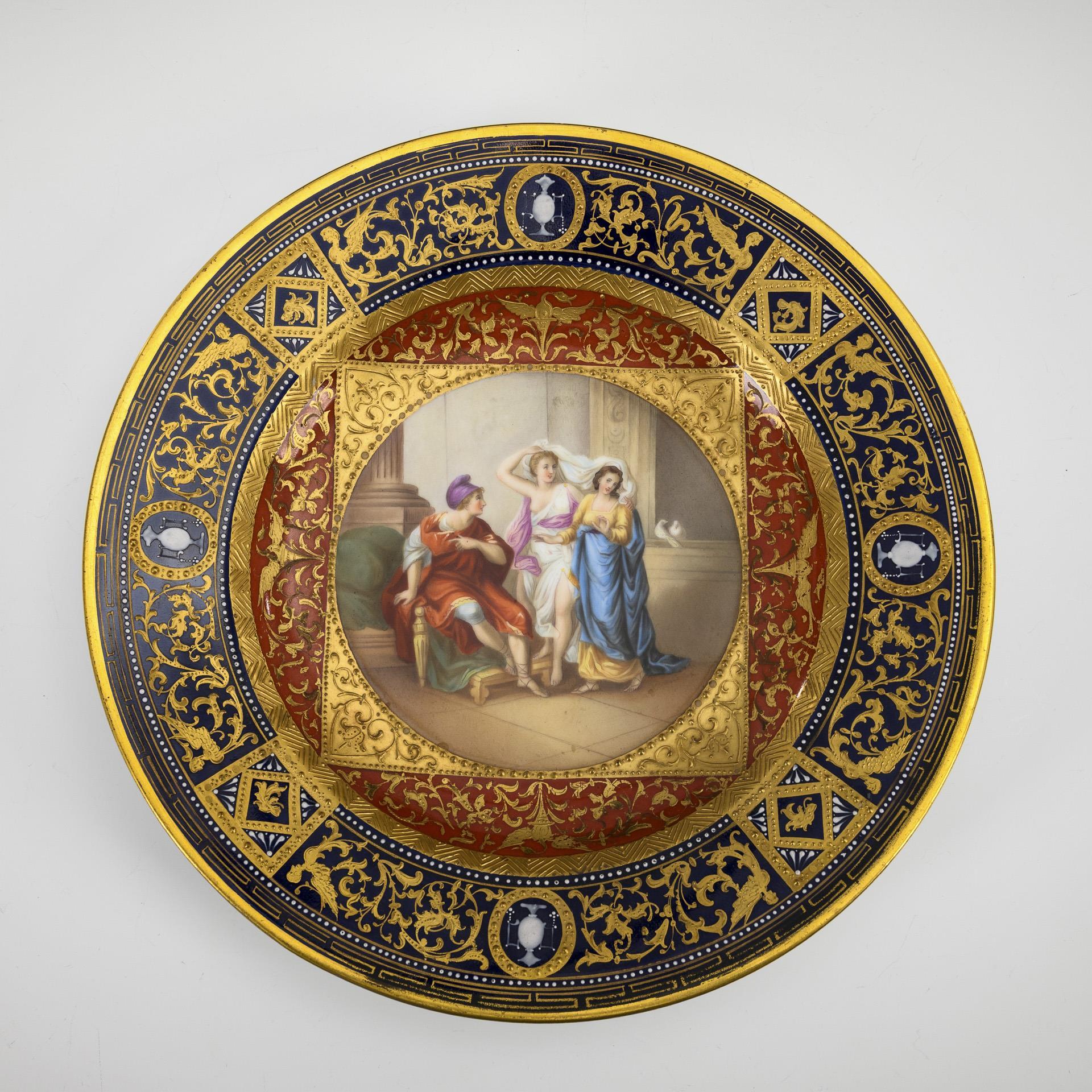 Prunkvoller Teller mit kobaltblauem und rostrotem Teilfond, reicher Reliefgold-Groteskenmalerei, weißer Emailmalerei und Juwelenmalerei; im Spiegel die Darstellung der Venus mit Liebespaar, im Hintergrund zwei Täubchen.