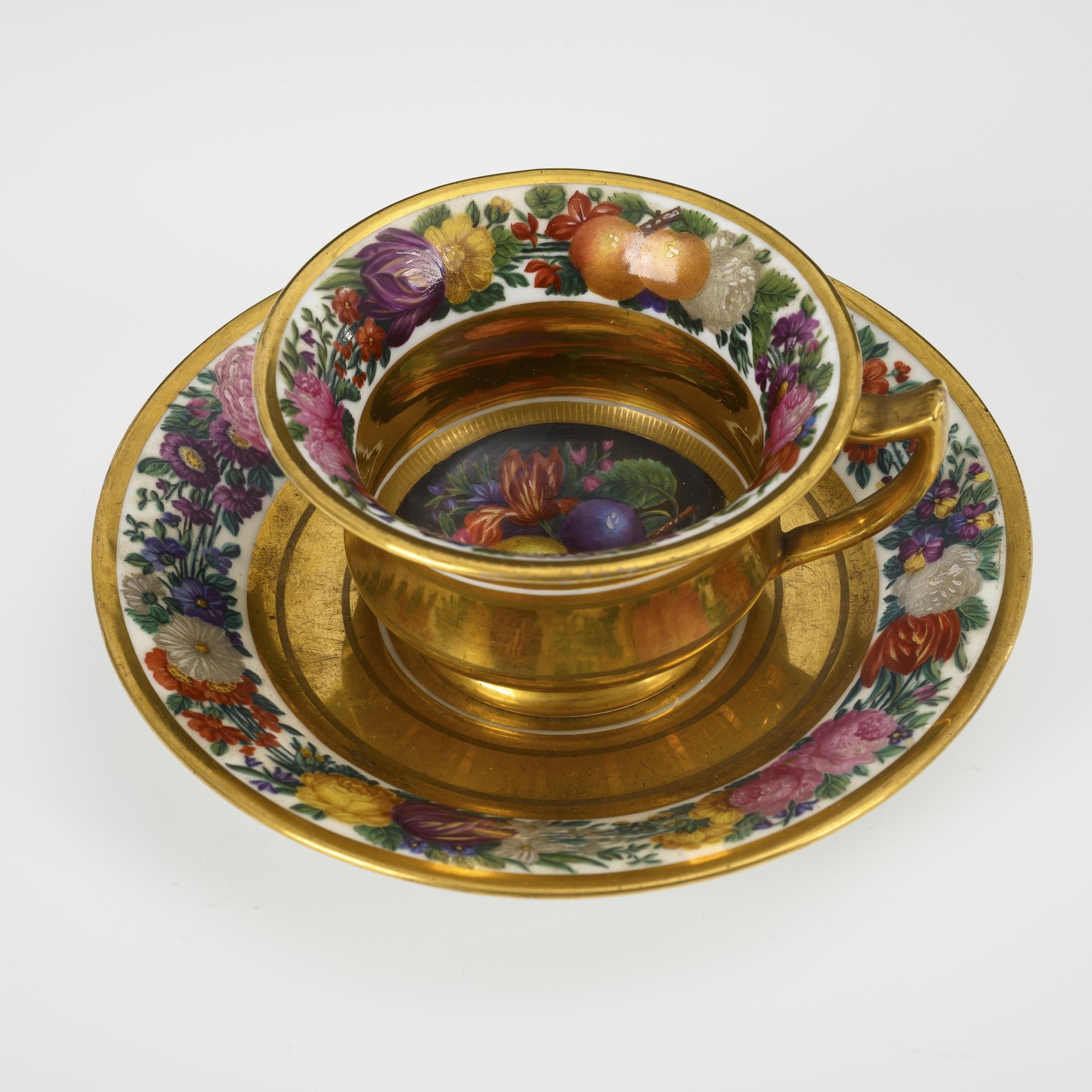 Polychrom bemalt, goldstaffiert. Tasse (H 6 cm), originale Untertasse (Ø 15,5 cm).