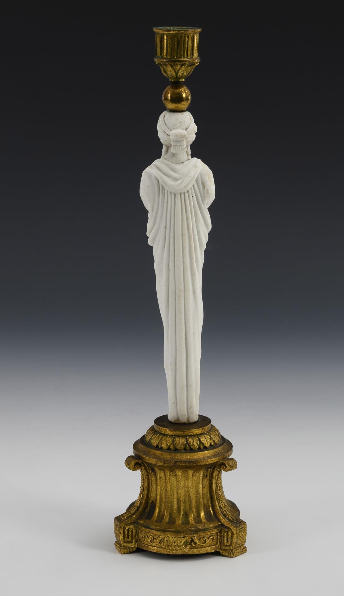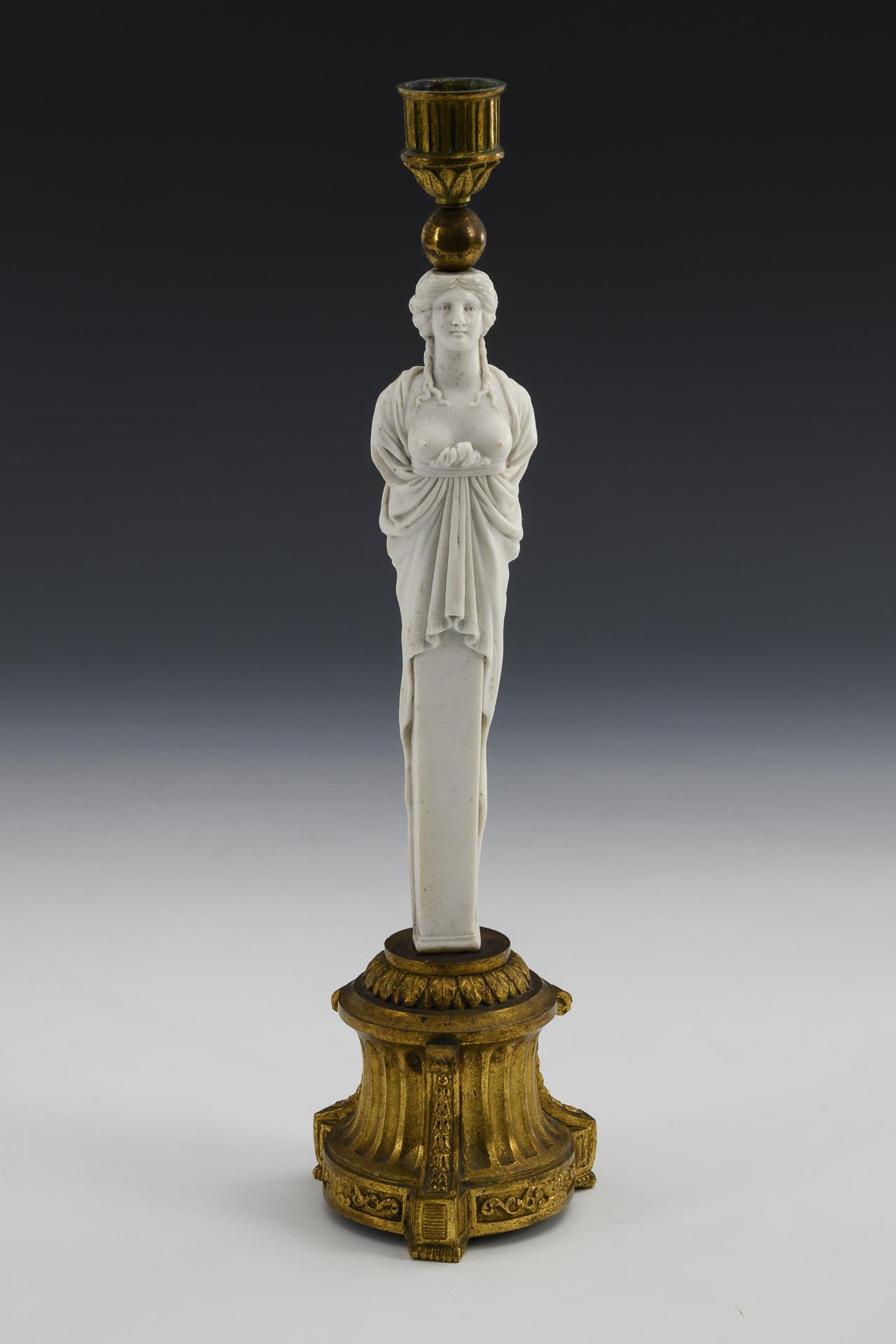 1-flammiger Leuchter mit Bronzetülle und -fuß sowie einem Biskuitschaft in Form einer antiken Karyatide.