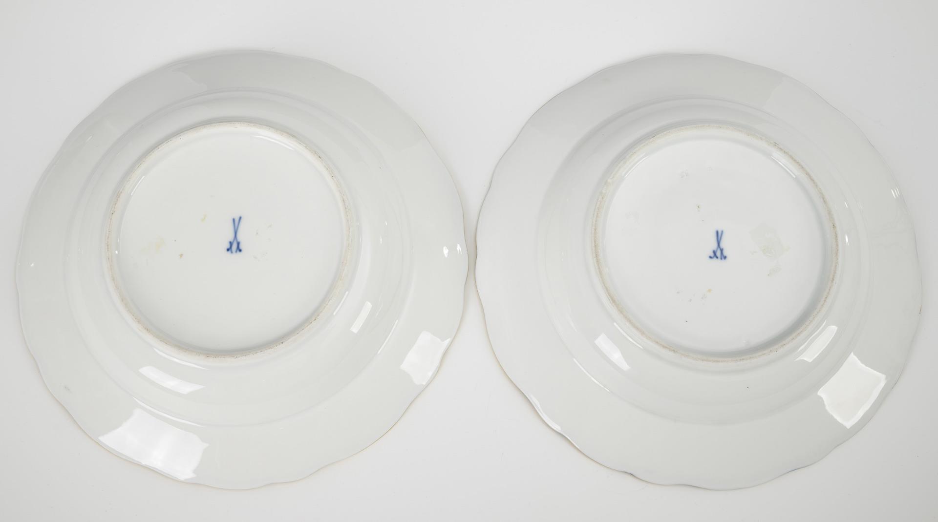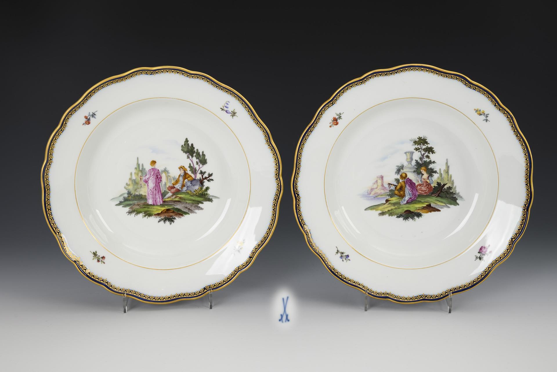 Modell "Neuer Ausschnitt". 2 Suppenteller mit kobaltblauem Rand und der Darstellung einer Parklandschaft mit galanten Paaren im Spiegel.