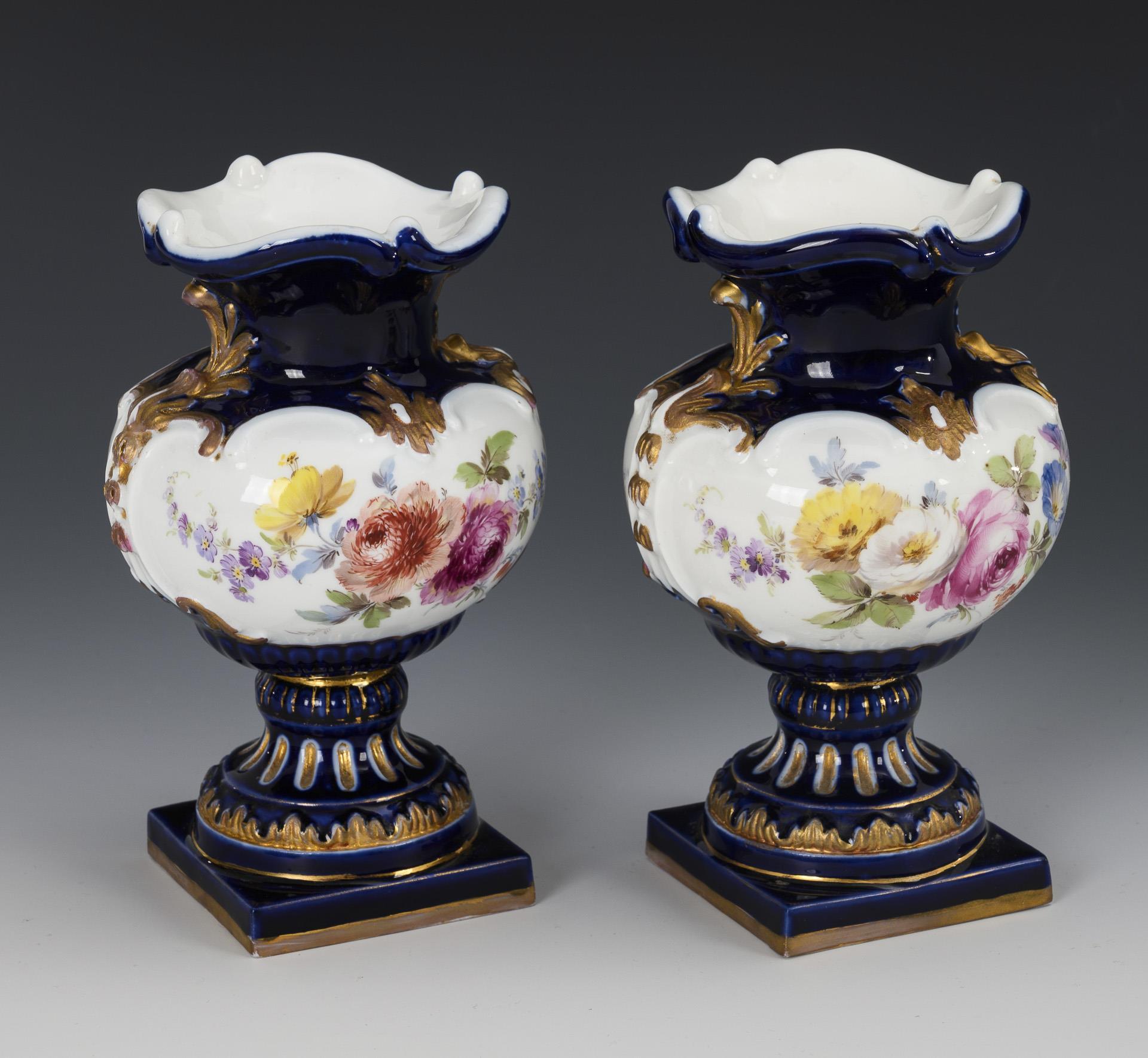 Balustervasen mit goldbronziertem Rocaillerelief, vierpassiger Mündung und Quadratplinthe. Kobaltblauer Teilfond, beidseitig die Darstellung eines Blumenbuketts. 1 goldretuschierter kleiner Chip am Fußrand, partiell minimaler Goldabrieb.