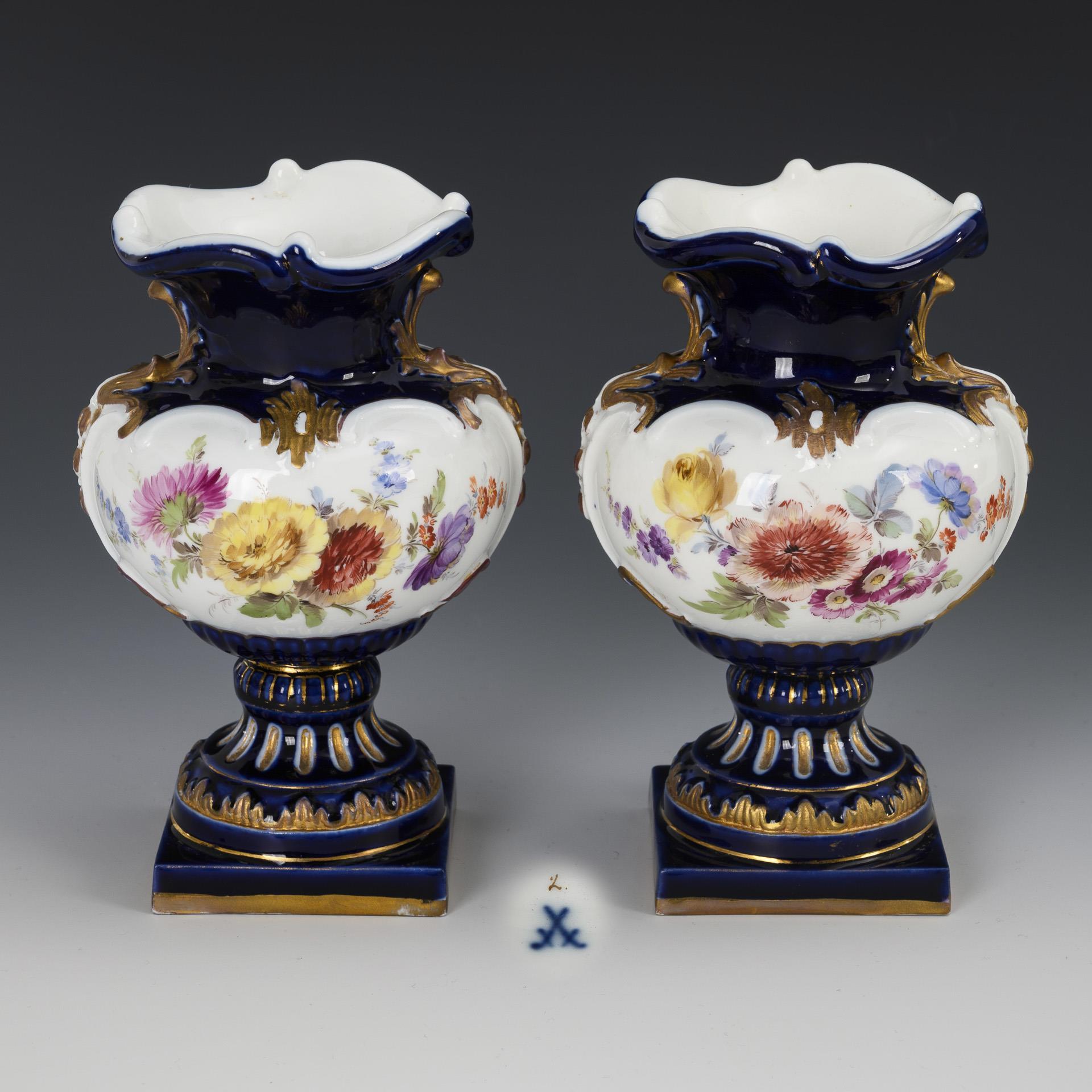 2 Vasen mit Kobaltfond und Blumenmalerei. Meissen.