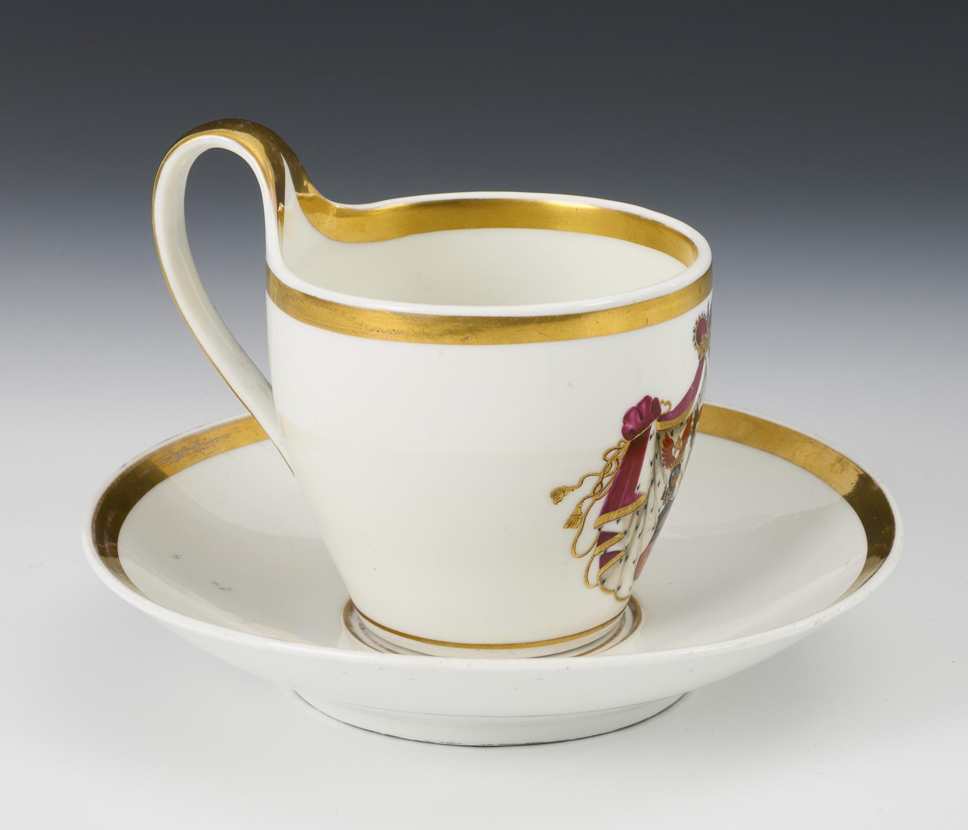Polychrom bemalt, gold- und silberstaffiert. Tasse (H 11 cm), originale Untertasse (Ø 18 cm).