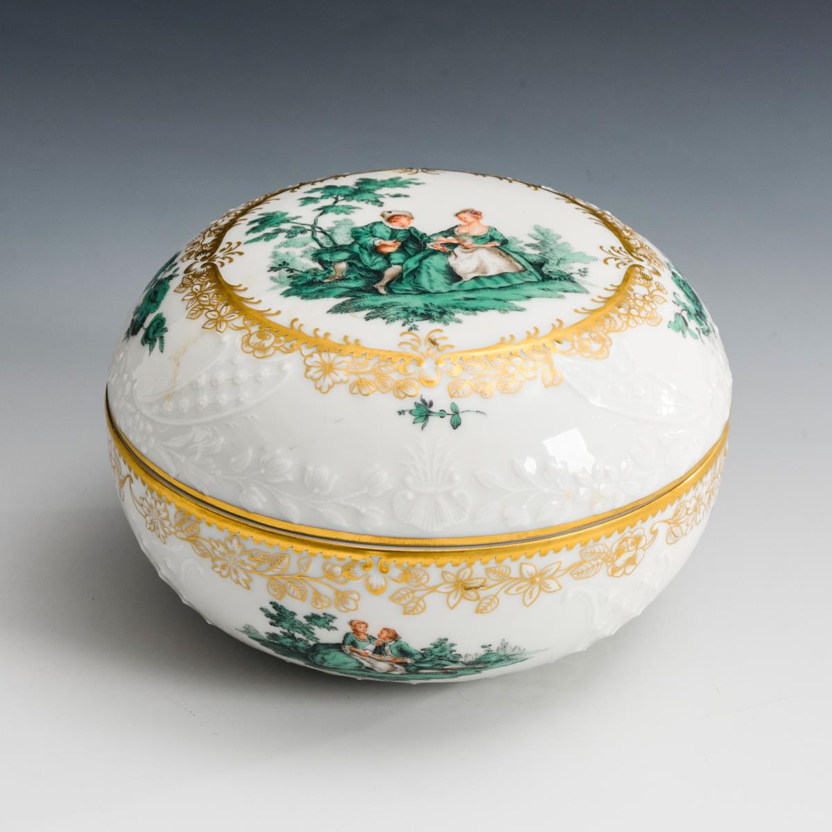 Dose mit kupfergrüner Watteaumalerei. Meissen.