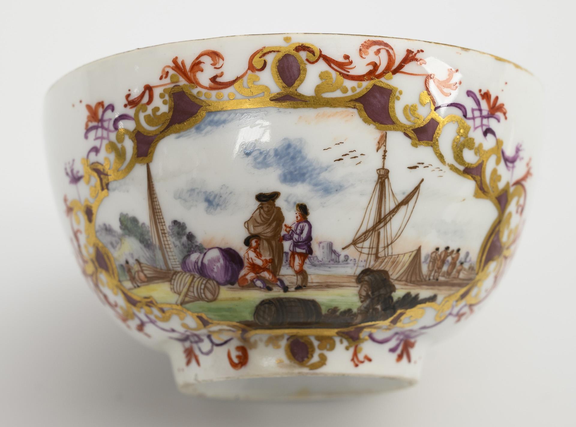 Beidseitig und im Spiegel der Untertasse eine goldrocaillegerahmte Kartusche, darin auf dem Koppchen die Darstellung von Küstenlandschaften mit Schiffen, Händlern und Waren, auf der Untertasse eine Landschaft mit Wirtshaus, Figuren und Reiter. Restaurierung am Standring der Tasse, Untertasse berieben.