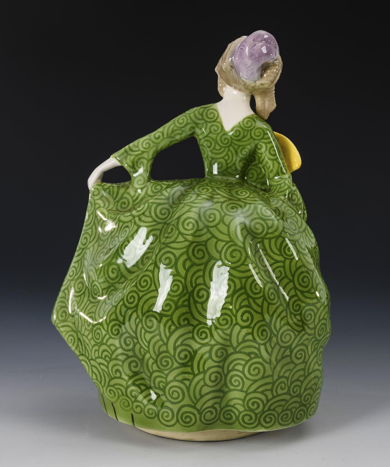 Elegante Dame in grünem Kleid und mit gelbem Fächer, auf Rundsockel. Partiell bestoßen.