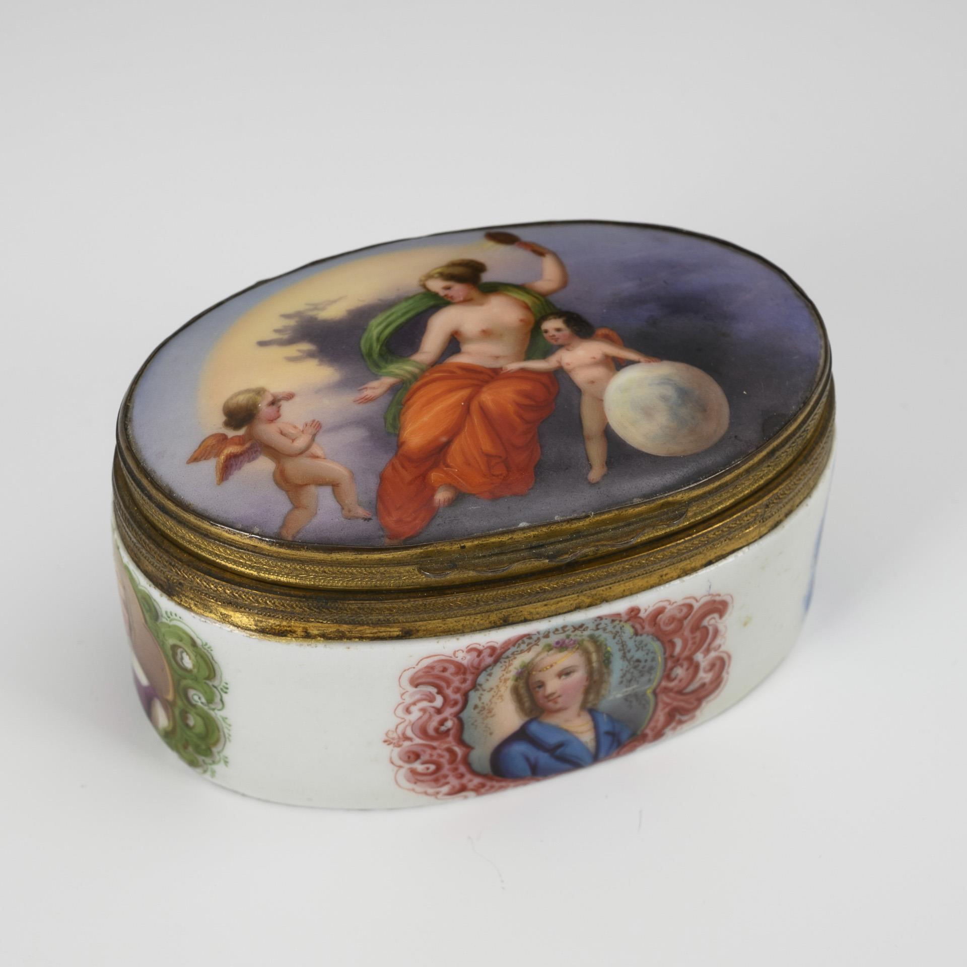 Ovale Dose mit metallmontiertem Scharnierdeckel. Auf dem (wohl ergänzten) Deckel die Darstellung einer Allegorie der Nacht, auf der Wandung verschiedene Damenbildnisse.