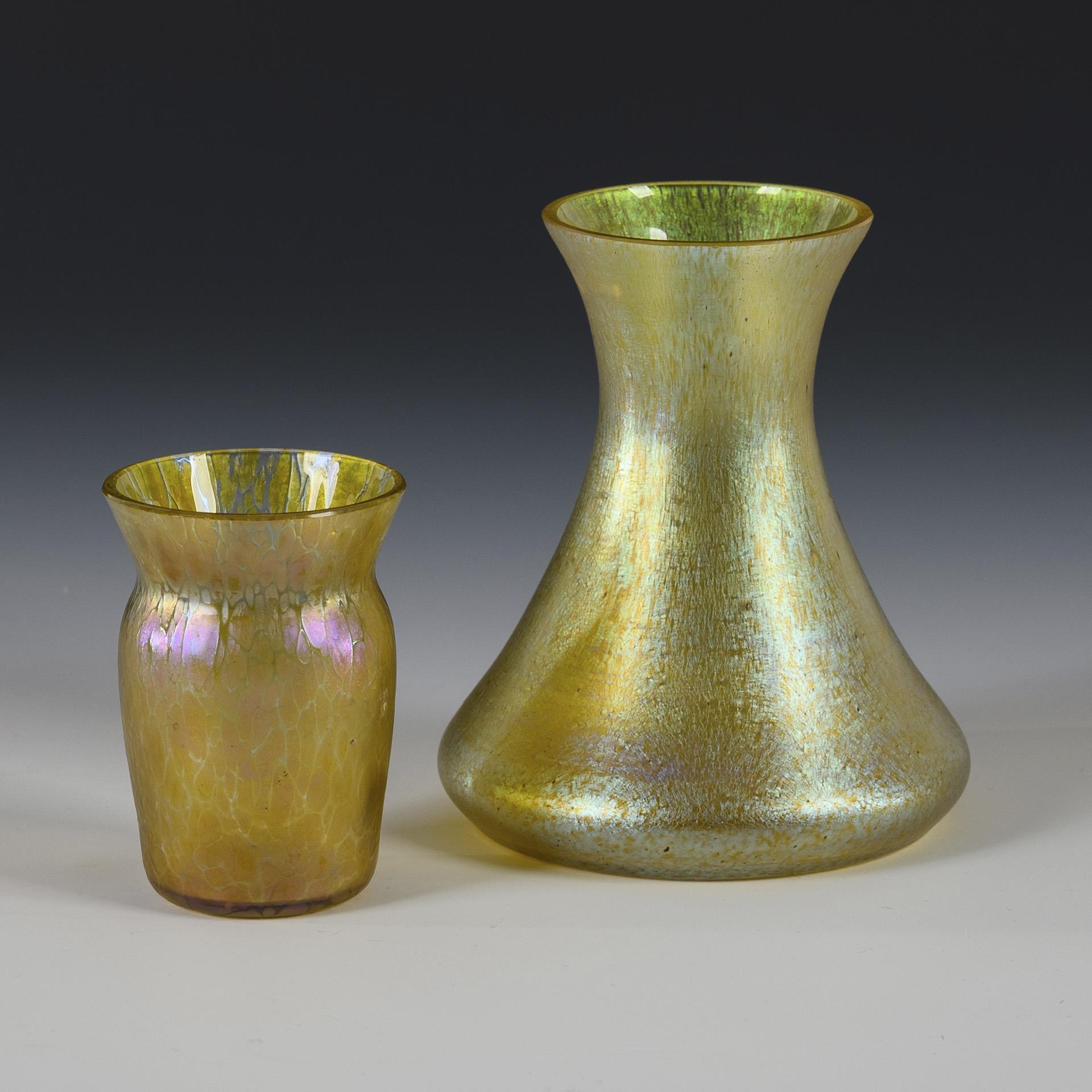 1x "Candia Papillon", 1898 (H 8 cm). / 1x "Silberiris", 1904 (H 12 cm). 1x minimale Bestoßung am Mündungsrand (Ø ca. 1 mm).