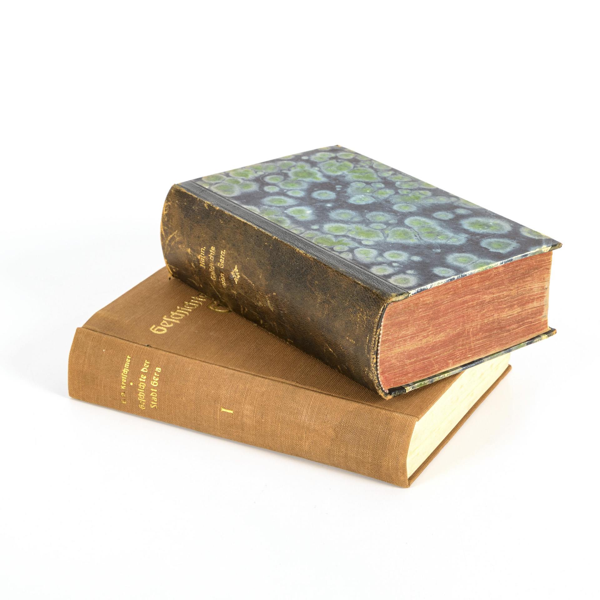 Ferdinand Hahn: "Geschichte von Gera und dessen nächster Umgebung", Gera 1850 (1855), Verlag des Verfassers, 1540 Seiten, im Halbledereinband, Rotschnitt, (20,5 x 14 cm). / Ernst Paul Kretschmer: "Geschichte der Stadt Gera und ihrer nächsten Umgebung", 1. Band, Kanitzsche Buchhandlung, Gera 1926. 12, 480 Seiten mit Abbildungen, im Leineneinband, (22,5 x 15 cm).