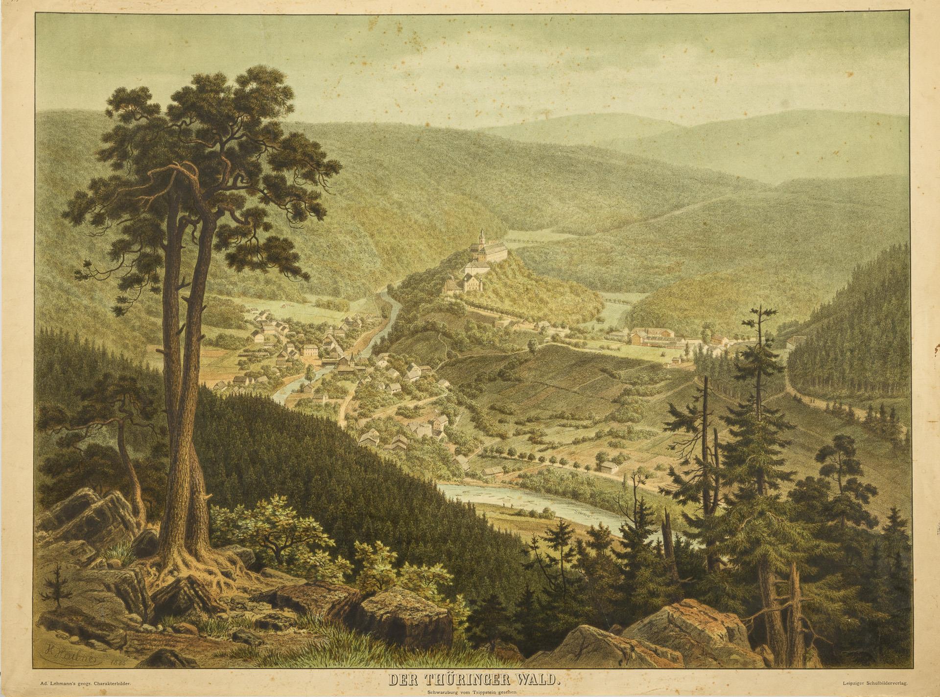 Schulwandkarte "Der Thüringer Wald - Schwarzburg vom Trippstein gesehen". Gezeichnet H. Heubner, 1885, aus As. Lehmanns geogr. Charakterbilder. Rückseite mit Werbetext. Altersspuren, etwas stockfleckig.