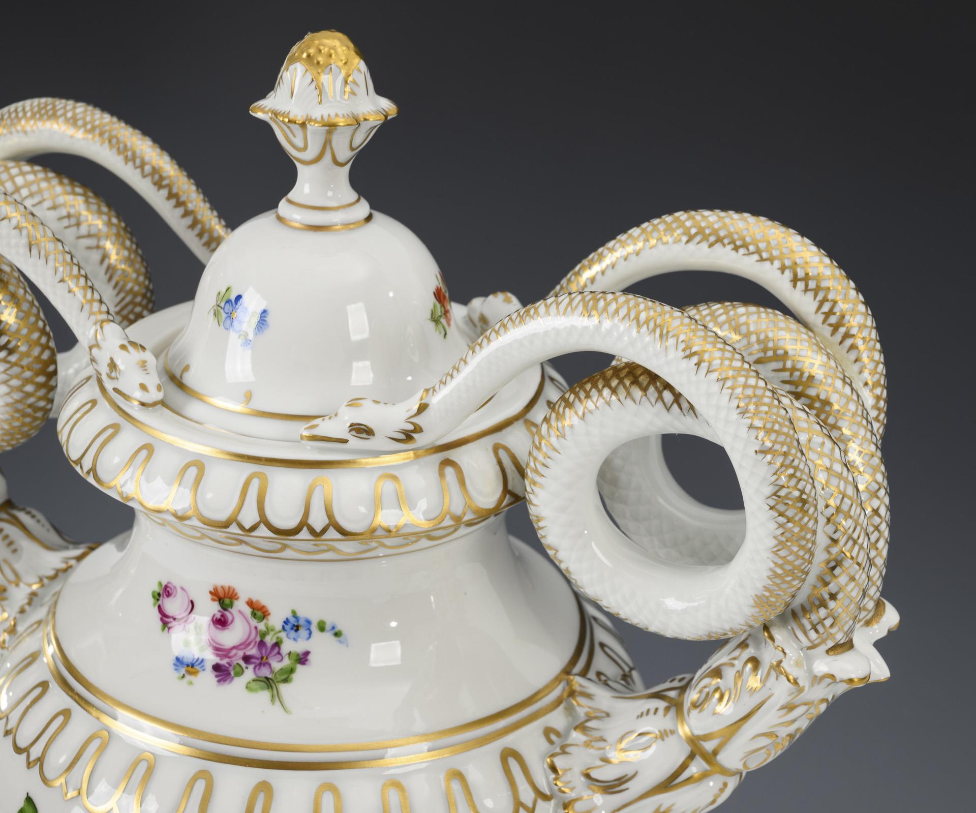 Schlangenhenkelvase mit Blumenmalerei. Potschappel.