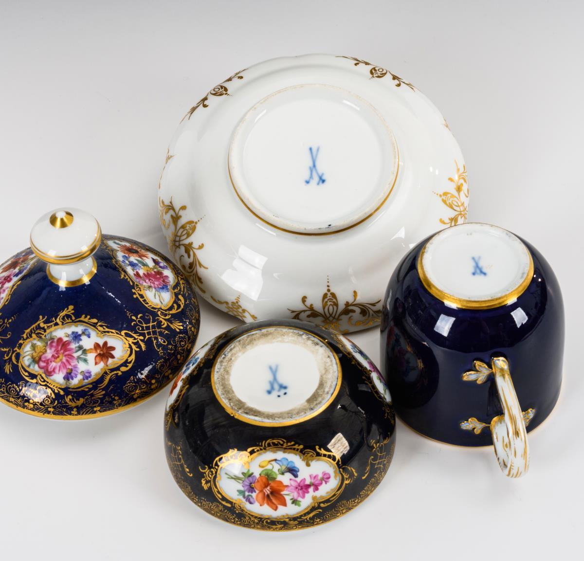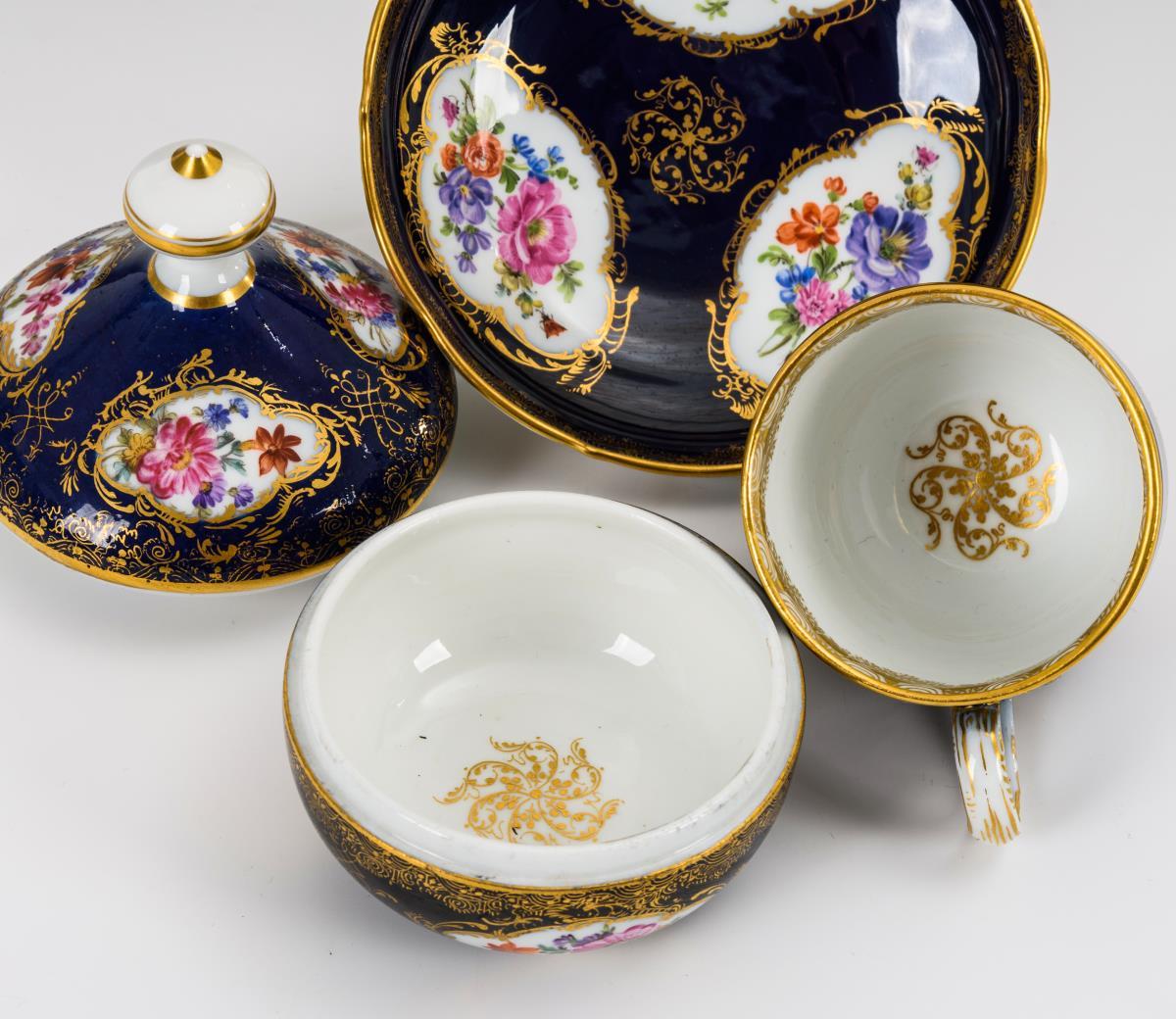 Kobaltblauer Teilfond, polychrome Blumenmalerei, Goldstaffage. Dose (H 10,5 cm), Tasse (H 7 cm) und Untertasse (Ø 13 cm).