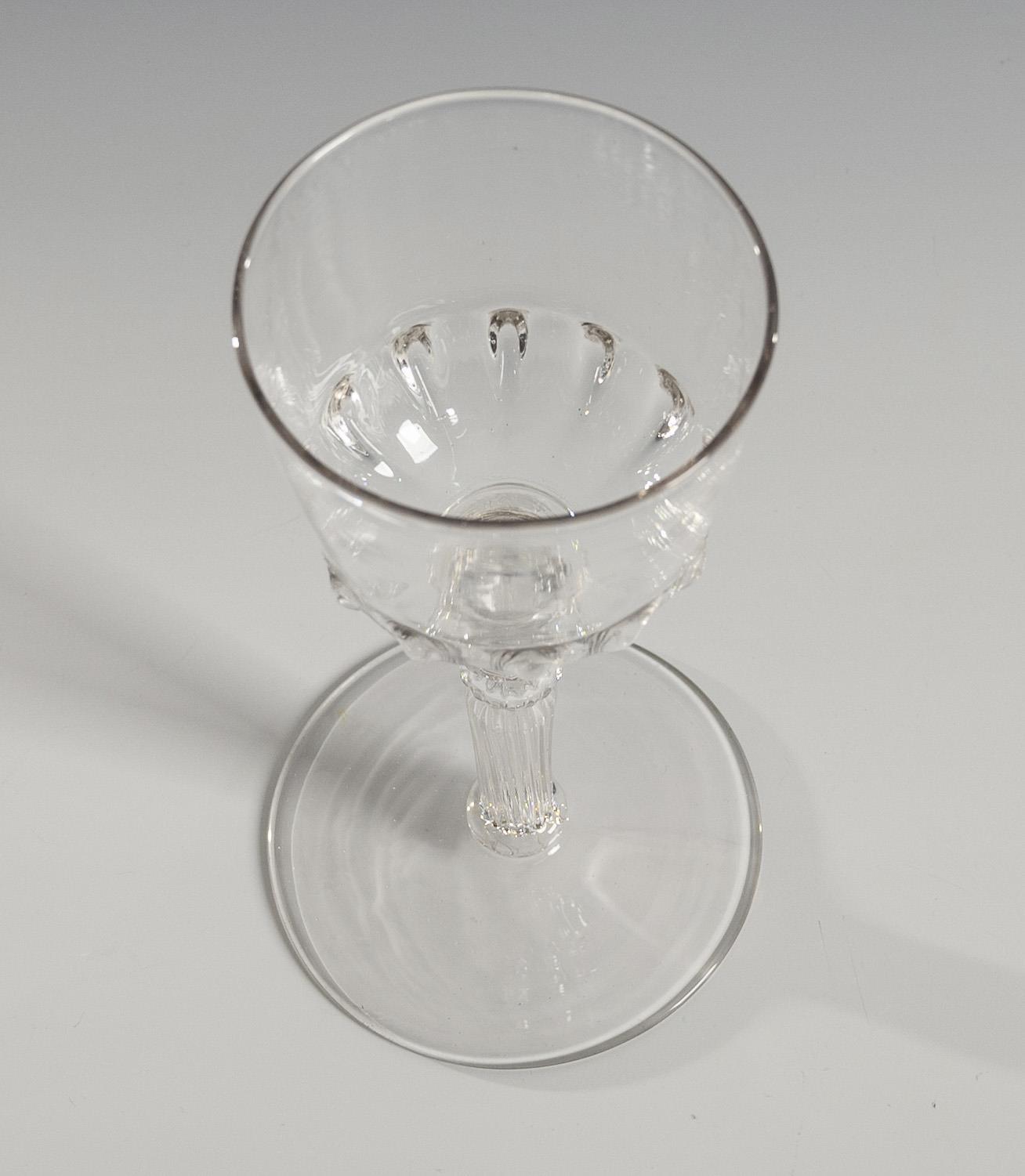 Konische Kuppa mit einem optischem Rippenkranz am Ansatz, längsoptisch gerillter Stängel mit zwei Nodi, Rundfuß; Abriss.