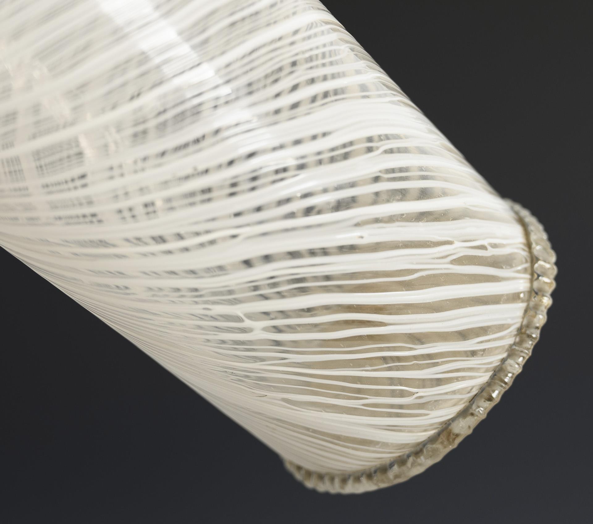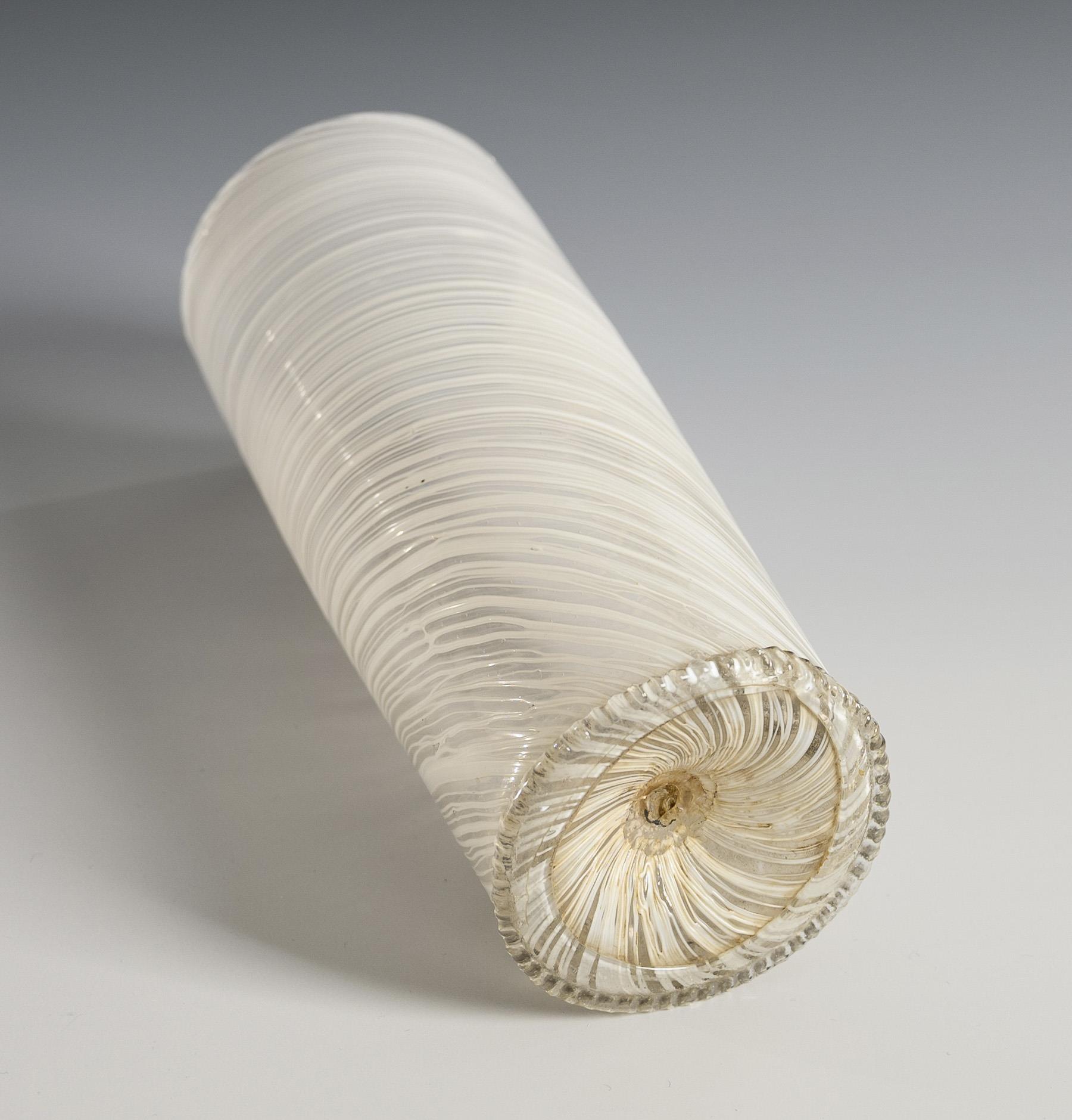 Farbloses, dünnwandiges Glas mit diagonal aufgelegten weißen Fäden. H 18 cm.