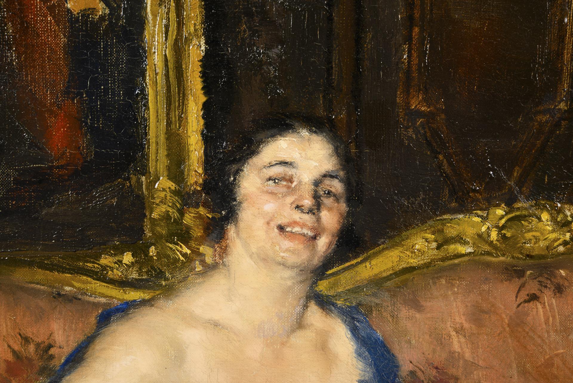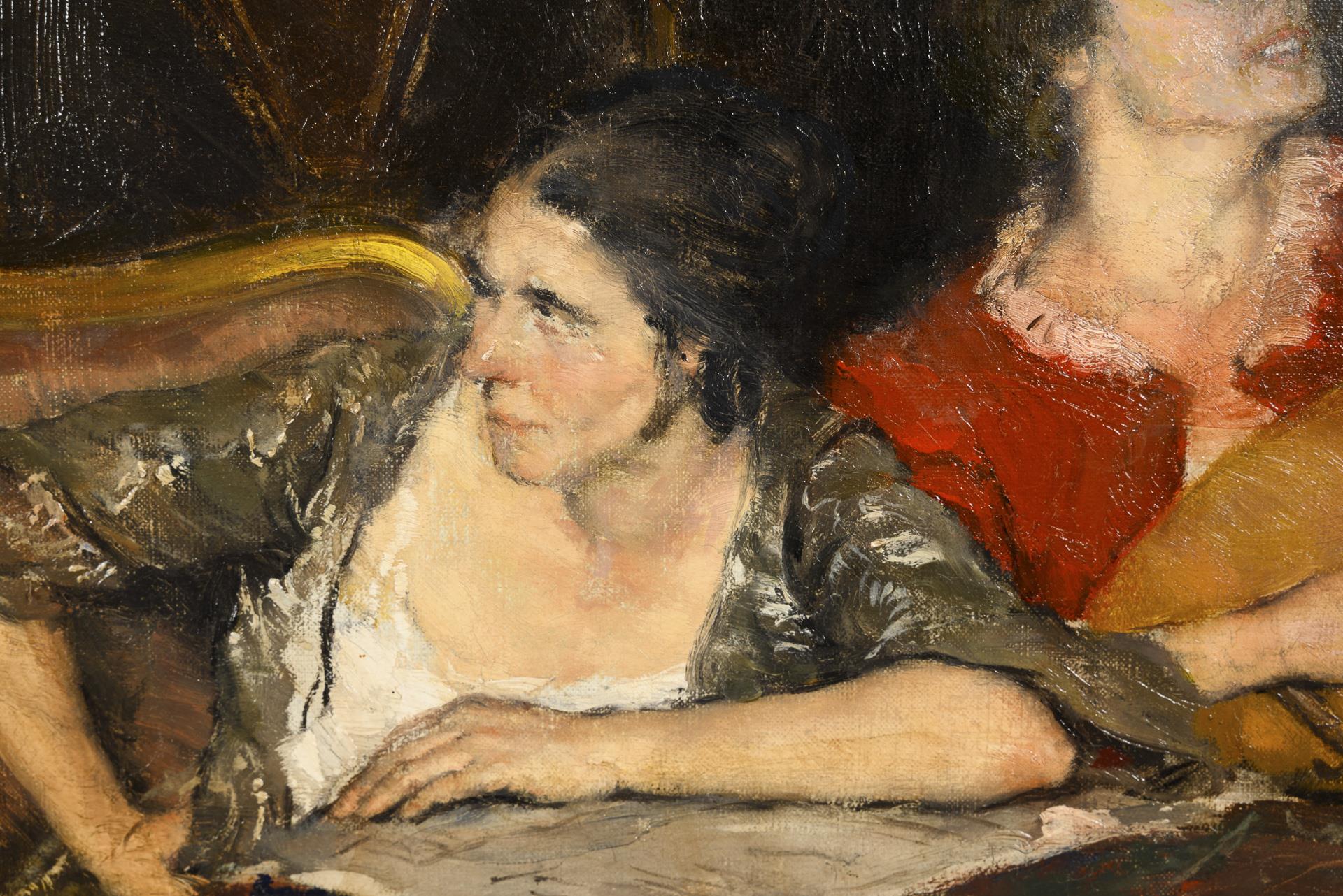 Drei Frauen in ausgelassener Stimmung mit Lauten auf einem Sofa vor einem Schrank mit Gemälde. Anbei und abgebildet in Burger, Willy: Péter Kálmán. Drei Eulen-Künstlerbücher Band IV. München.