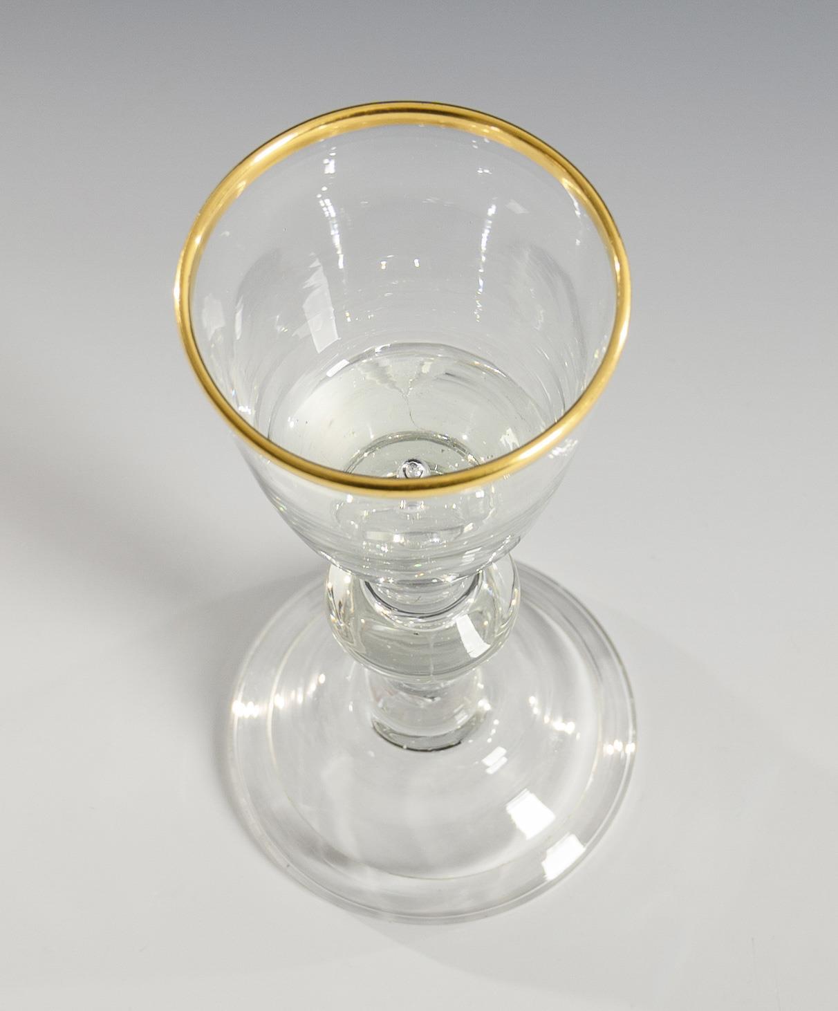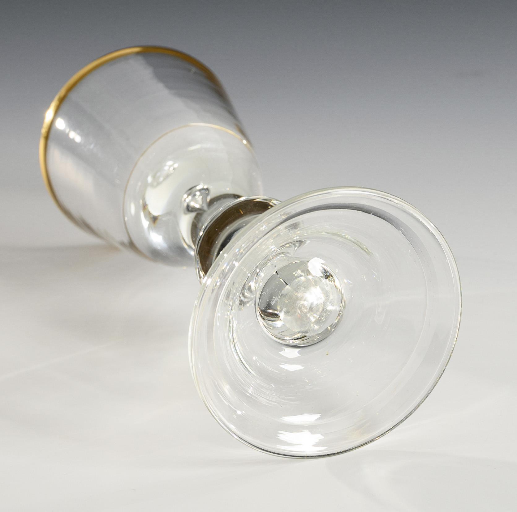 Konische Kuppa mit eingestochener Luftblase im massiven Kuppaboden, Balusterschaft mit eingestochener Luftblase, hutartiger Fuß; ausgeschliffener Abriss.