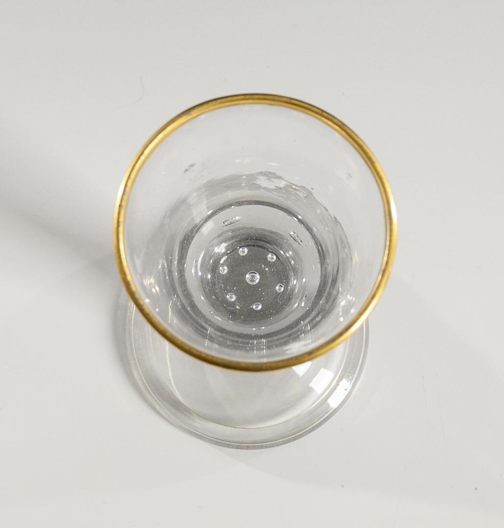 Konische, in den massivem Schaft übergehende Kuppa mit sieben eingestochenen Luftblasen am Kuppaboden, Rundfuß; Abriss. Minimaler Goldabrieb.