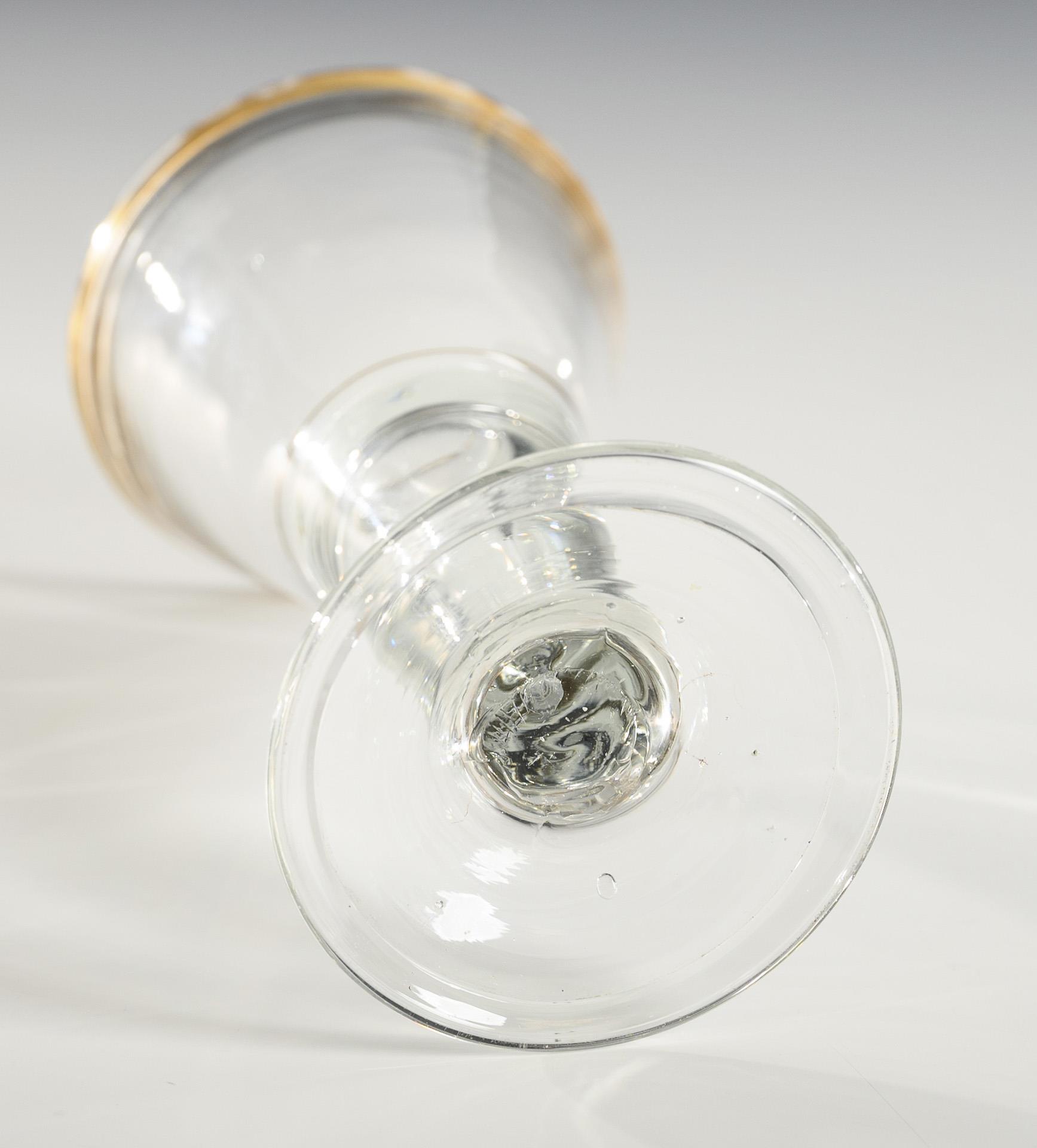 Konische, in den Schaft mit eingestochener Luftblase übergehende Kuppa, Rundfuß mit umgeschlagenem Rand; Abriss. Gold berieben.