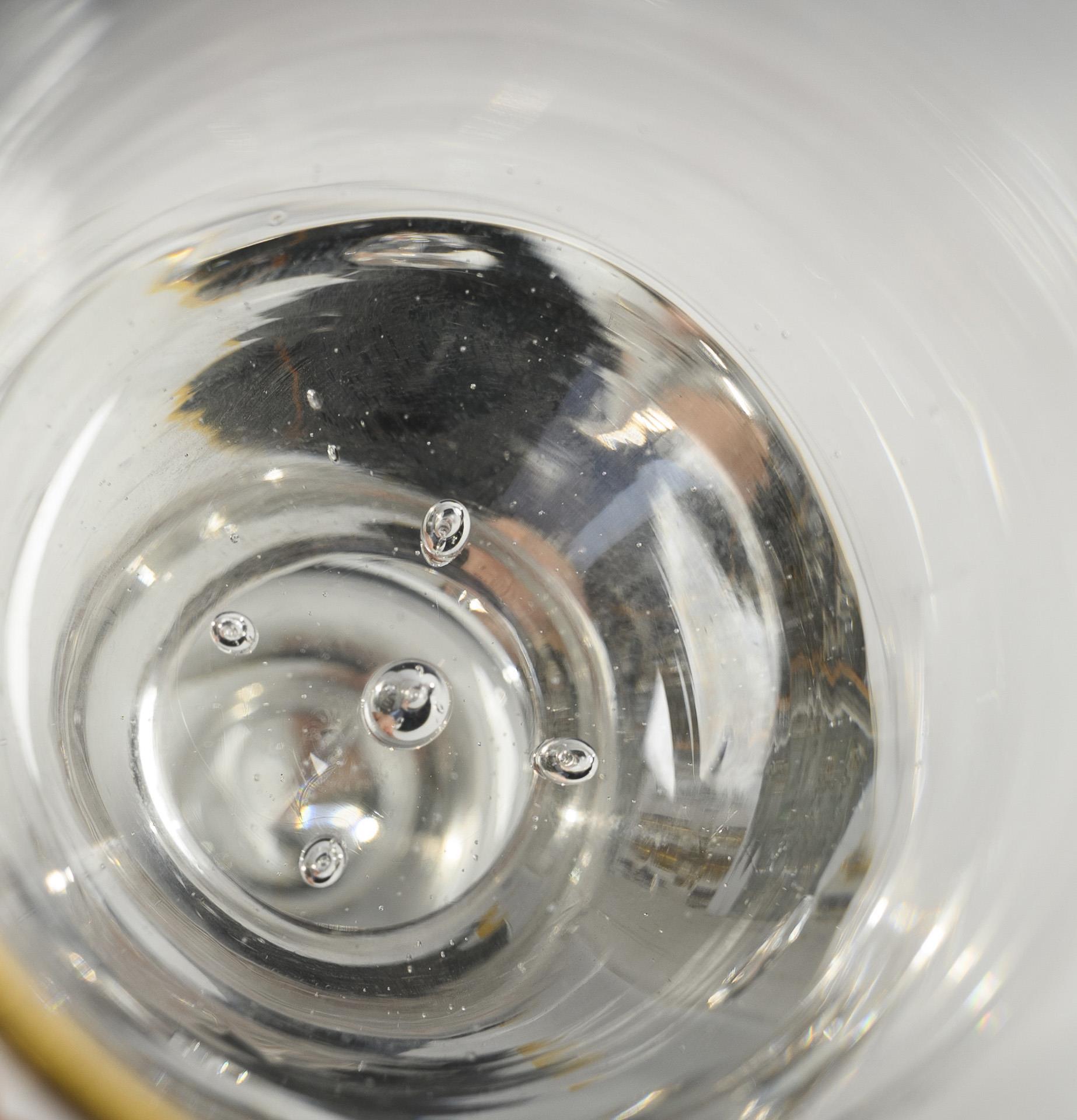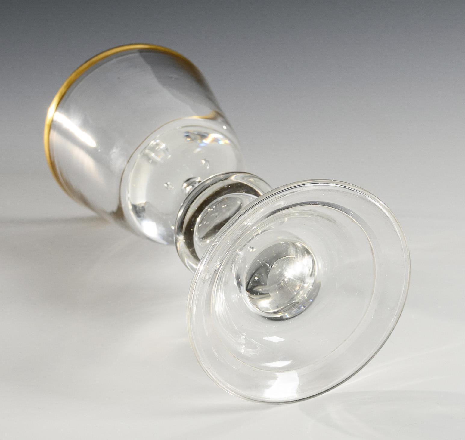 Konische Kuppa mit einem eingestochenen Luftblasenkranz im Boden, Balusterschaft mit eingestochener Luftblase, Glockenfuß mit umgeschlagenem Rand; ausgeschliffener Abriss.