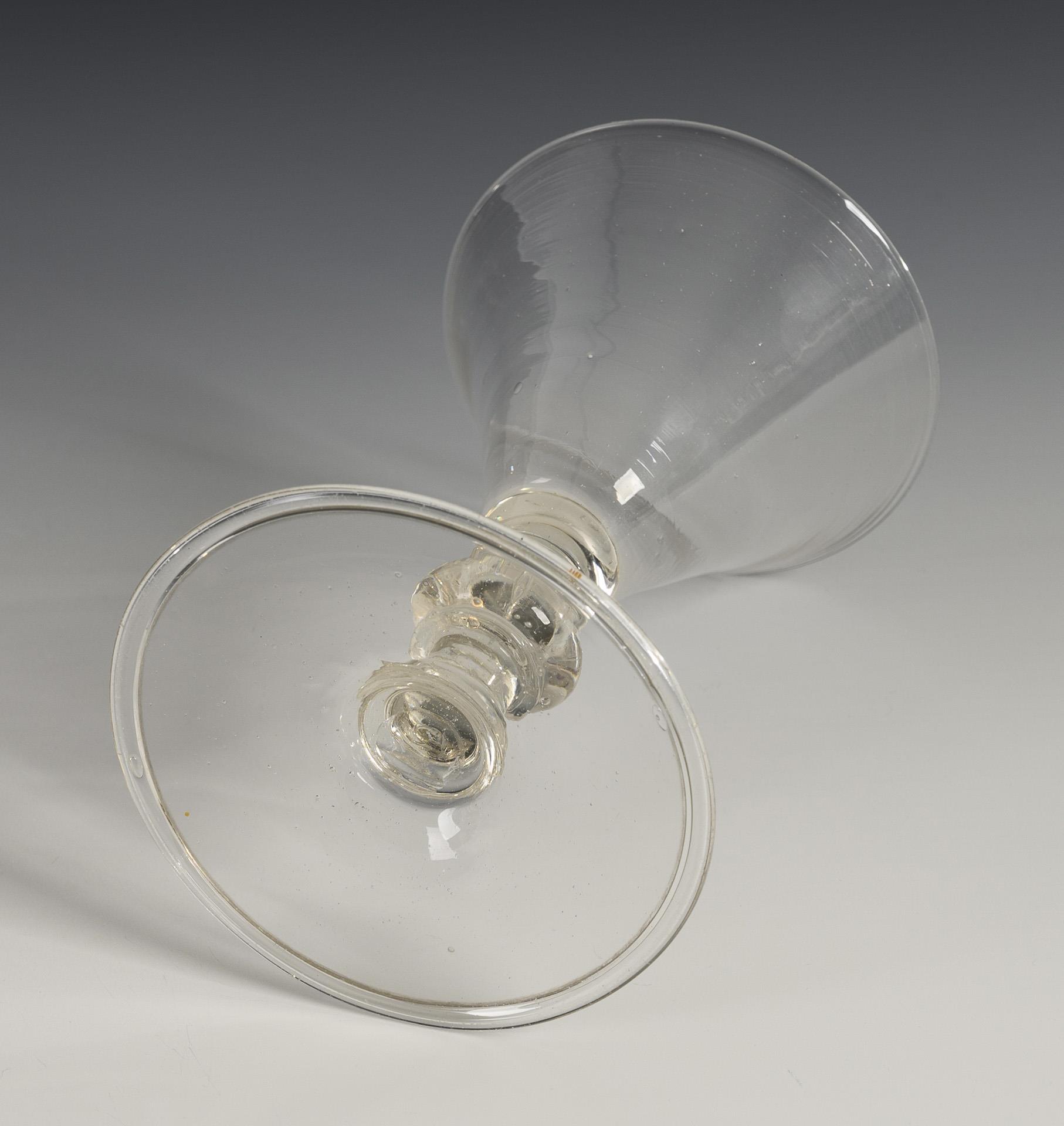 Trichterkuppa mit massivem Boden, mehrfach gegliederter Schaft mit Scheibennodi und gedrücktem Kugelnodus, Scheibenfuß mit umgeschlagenem Rand; Abriss.