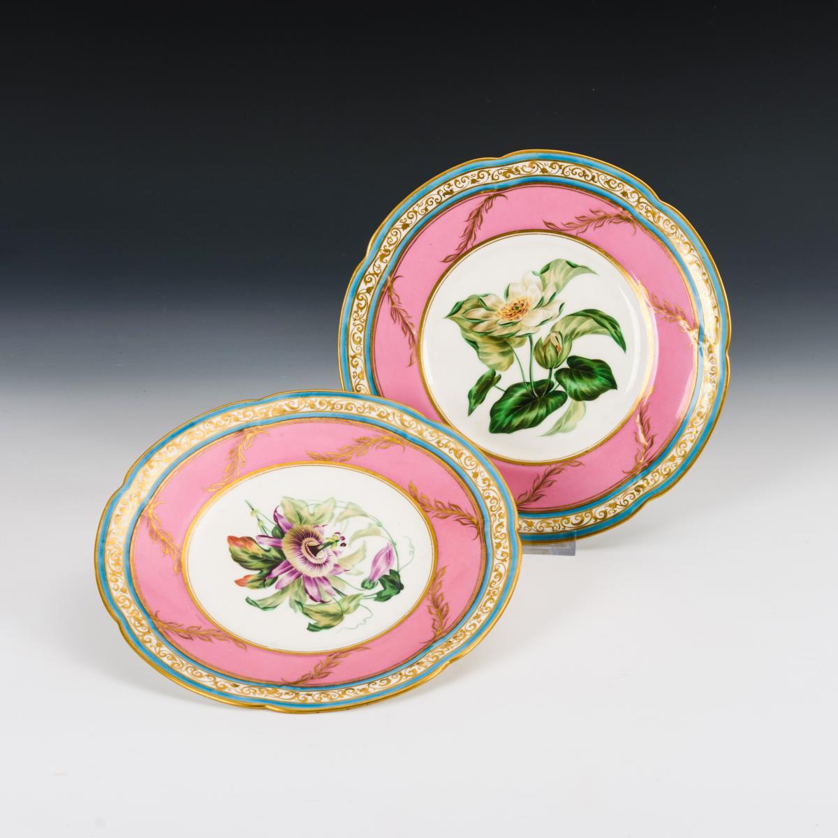Passige Teller mit rosa Teilfond und reicher Goldmalerei, im Spiegel jeweils eine Passionsblume bzw. Seerose.