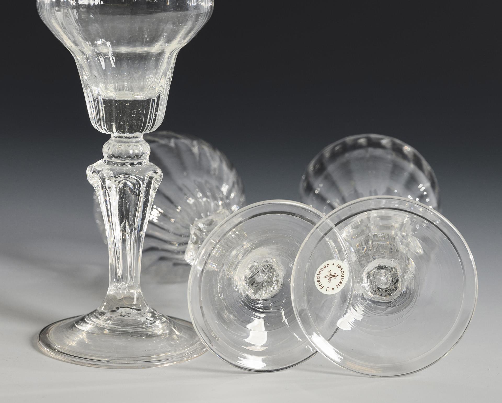 Längsoptisch formgeblasene Glockenkuppa, pseudofacettierter Schaft, Rundfuß mit umgeschlagenem Rand; Abriss.